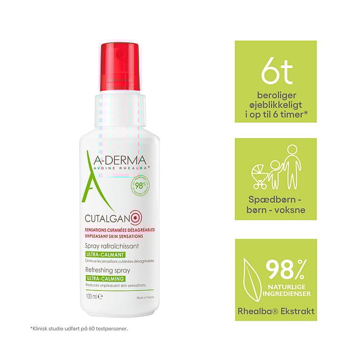 - Passar bra när huden känns irriterad, stram, kliande* och överhettad. Dessa obehag kan kännas smärtsamma och försvagar huden. Cutalgan Refreshing Spray lindrar symptomen med en kylande och lugnande effekt tack vare extrakt från lian