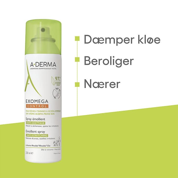 Spraya på kroppen på ca 15 cm avstånd. Massera lätt ut produkten på huden. Vid applicering i ansikte; spraya produkten i händerna och massera enkelt ut på aktuellt område. Ny effektiv formula gör att A-DERMA Exomega CONTROL endast behöver appliceras 1 gång per dag