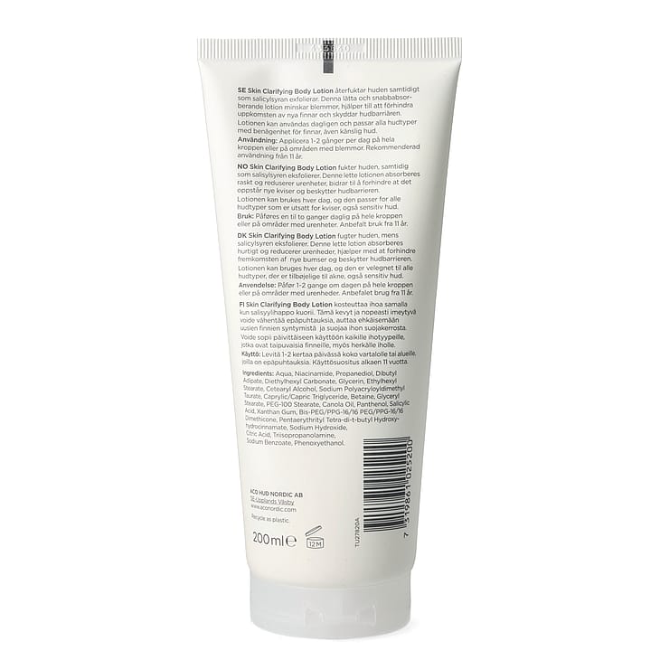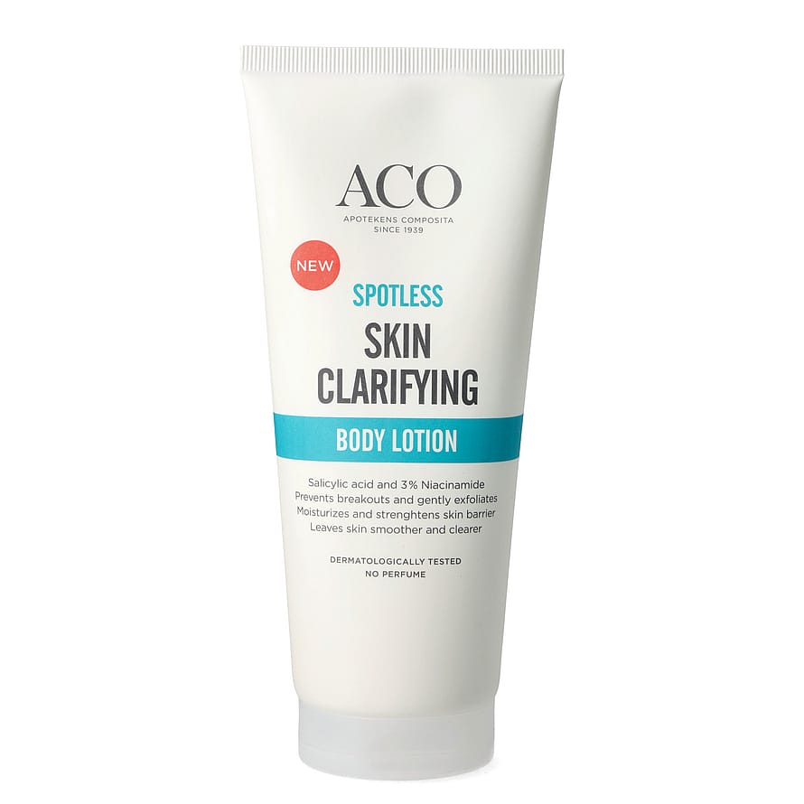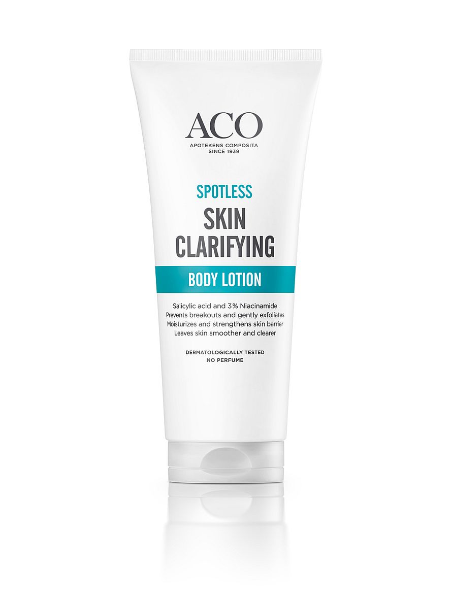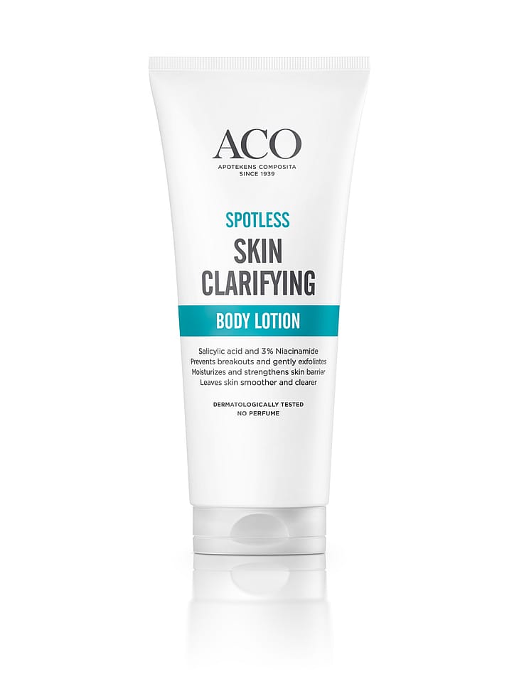 ACO Skin Clarifying Body Lotion återfuktar huden samtidigt som salicylsyran exfolierar. Denna lätta och snabbabsorberande lotion minskar blemmor, hjälper till att förhindra uppkomsten av nya finnar och skyddar hudbarriären. För en klarare, jämnare och återfuktad hud. Oparfymerad. Dermatologiskt testad.
