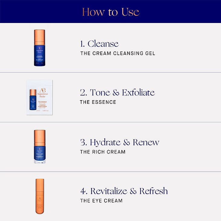 The Cream Cleansing Gel:, Aqua/Water/Eau, Glycerin, Prunus Amygdalus Dulcis (Sweet Almond) Oil, Rosa Damascena Flower Water, Disodium Cocoyl Glutamate, Coco-Glucoside, Xanthan Gum, 1, 2-Hexanediol, Citric Acid, Sodium Chloride, Carrageenan, Coconut Acid, O-Cymen-5-Ol, Cucumis Sativus (Cucumber) Fruit Extract, Helianthus Annuus (Sunflower) Seed Oil, Tocopherol, Hydrolyzed Rice Protein, Maltodextrin, Aloe Barbadensis Leaf Juice Powder, Camellia Sinensis Leaf Extract, Hydrogenated Lecithin, Tocopheryl Acetate, Alanyl Glutamine, Arginine, Oligopeptide-177, Phenylalanine, Potassium Sorbate, Sisymbrium Irio Seed Oil., The Essence:, Aqua/Water/Eau, Glycerin, Gluconolactone, Lactobacillus/Wasabia Japonica Root Ferment Extract, Phytic Acid, Sodium Hydroxide, Potassium Sorbate, Xanthan Gum, Sodium Benzoate, Salicylic Acid, Caesalpinia Spinosa Gum, Paeonia Lactiflora Root Extract, Papain, Citric Acid, Sodium Hyaluronate, Hydrolyzed Rice Protein, Maltodextrin, 1, 2-Hexanediol, Caprylyl Glycol, Carbomer, N-Hydroxysuccinimide, Camellia Sinensis Leaf Extract, Hydrogenated Lecithin, Tocopheryl Acetate, Algin, Alanyl Glutamine, Arginine, Oligopeptide-177, Phenylalanine, Sisymbrium Irio Seed Oil, Sodium Chloride., The Eye Cream:, Aqua/Water/Eau, Glycerin, Coco-Caprylate/Caprate, Panthenol, Ethyl Oleate, Ethylhexyl Polyhydroxystearate, Squalane, Glyceryl Stearate Citrate, Hydrogenated Vegetable Glycerides, Niacinamide, Ascorbyl Tetraisopalmitate, Sodium Stearoyl Glutamate, Polyglyceryl-3 Stearate, Oleic Acid, Cocos Nucifera (Coconut) Oil, Silica, Simmondsia Chinensis (Jojoba) Seed Oil, Hydrogenated Lecithin, Undaria Pinnatifida Extract, Xanthan Gum, Potassium Sorbate, Citric Acid, Sodium Benzoate, Terminalia Arjuna Extract, Centella Asiatica Flower/Leaf/Stem Extract, Hydrolyzed Rice Protein, Maltodextrin, Sodium Phytate, Lecithin, Corallina Officinalis Extract, Camellia Sinensis Leaf Extract, Tocopheryl Acetate, Tocopherol, Alanyl Glutamine, Arginine, Oligopeptide-177, Sodium Chloride, Phenylalanine, Sisymbrium Irio Seed Oil., The Rich Cream:, Aqua/Water/Eau, Coco-Caprylate/Caprate, Helianthus Annuus (Sunflower) Seed Oil, Squalane, Glycerin, Argania Spinosa Kernel Oil, Ethyl Oleate, Persea Gratissima (Avocado) Oil, Polyglyceryl-4 Oleate, Magnesium Sulfate, Oenothera Biennis (Evening Primrose) Oil, Panthenol, Polyglyceryl-6 Oleate, Zinc PCA, Polyhydroxystearic Acid, Butylene Glycol, Butyrospermum Parkii (Shea) Butter, Potassium Sorbate, Sodium Benzoate, Tocopherol, Sodium Hyaluronate, Hydrolyzed Rice Protein, Maltodextrin, Citric Acid, Camellia Sinensis Leaf Extract, Hydrogenated Lecithin, Tocopheryl Acetate, Xanthan Gum, Alanyl Glutamine, Arginine, Oligopeptide-177, Phenylalanine, Sisymbrium Irio Seed Oil, Sodium Chloride, Dextran, Palmitoyl Tripeptide-8.
