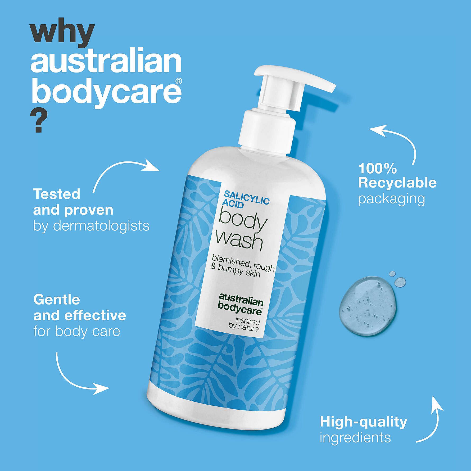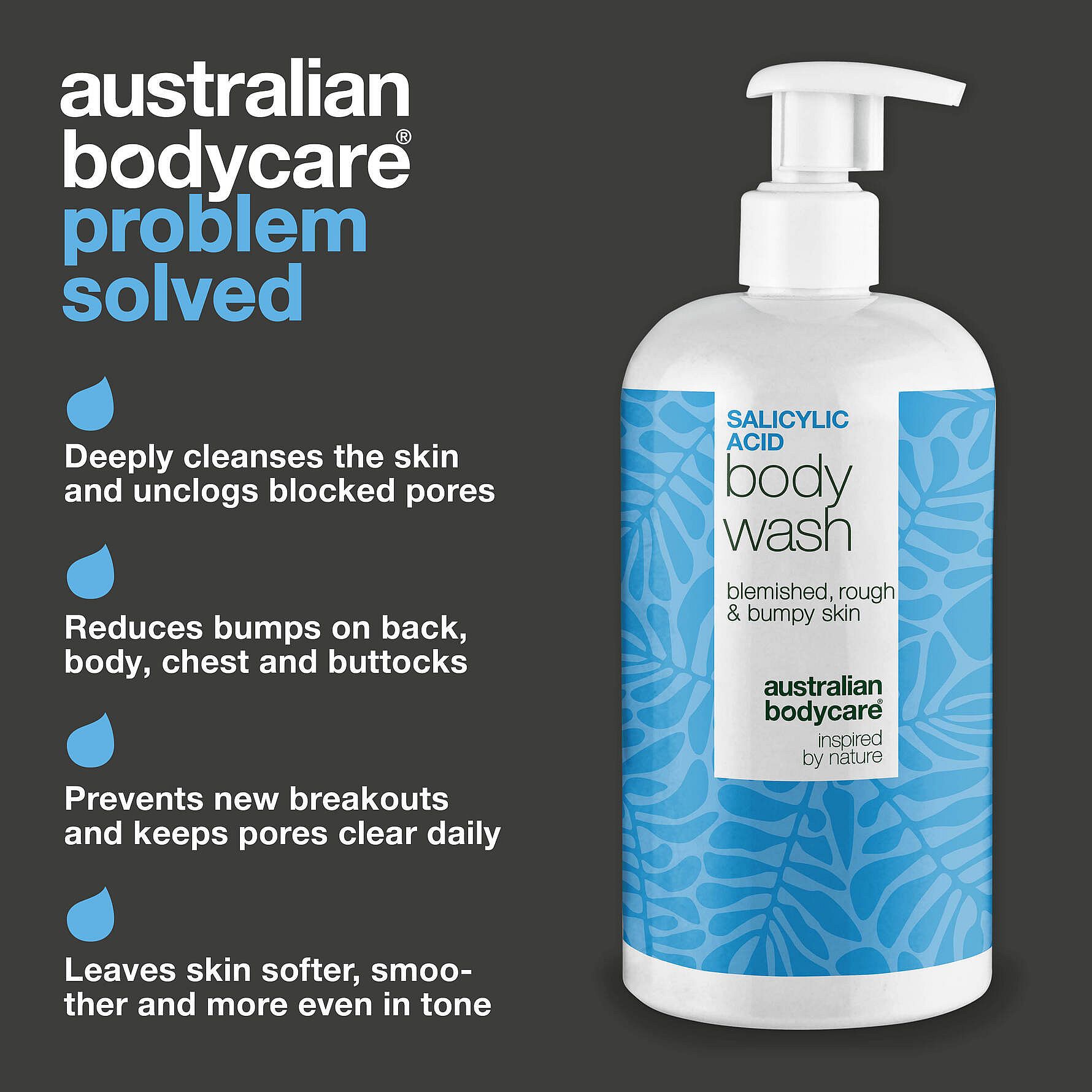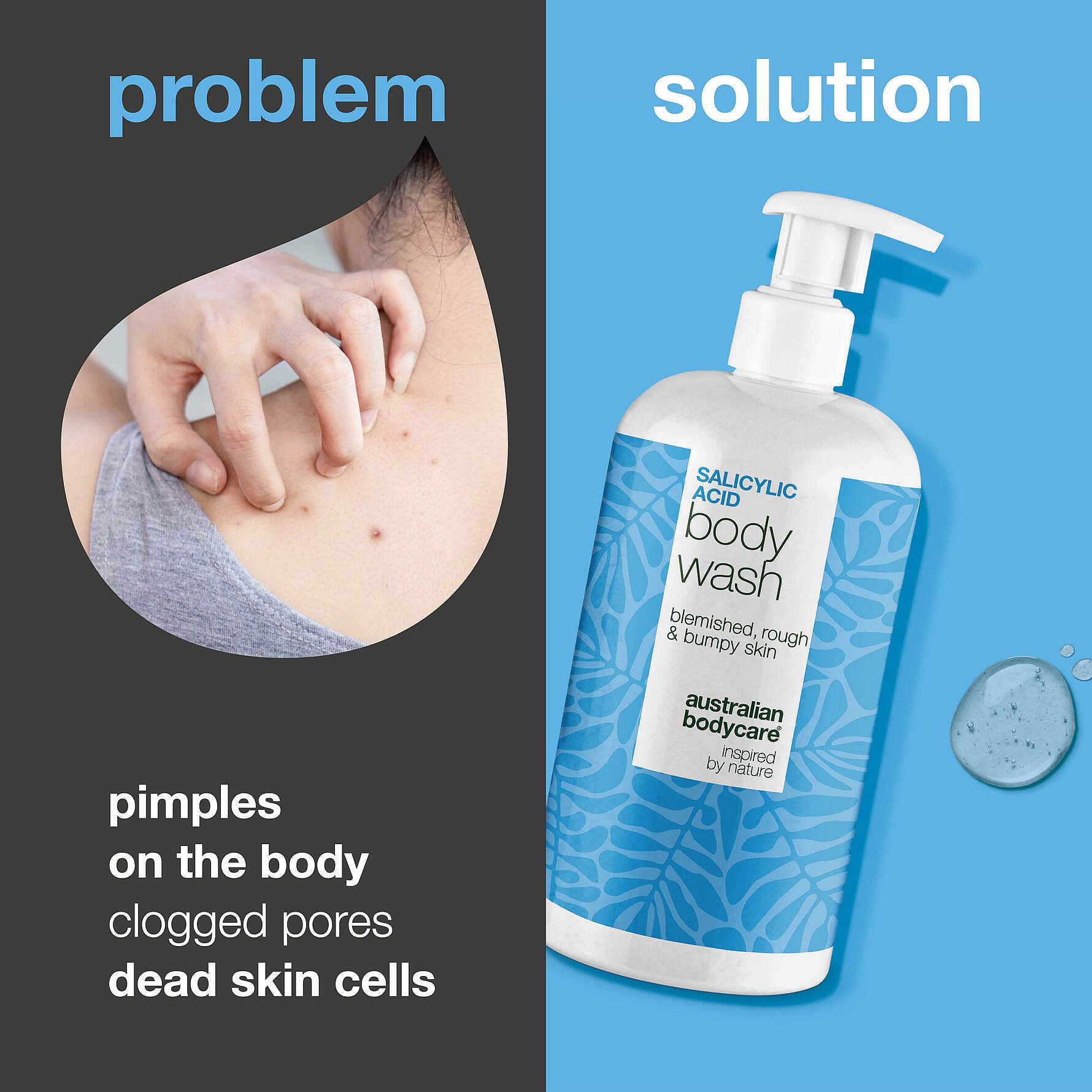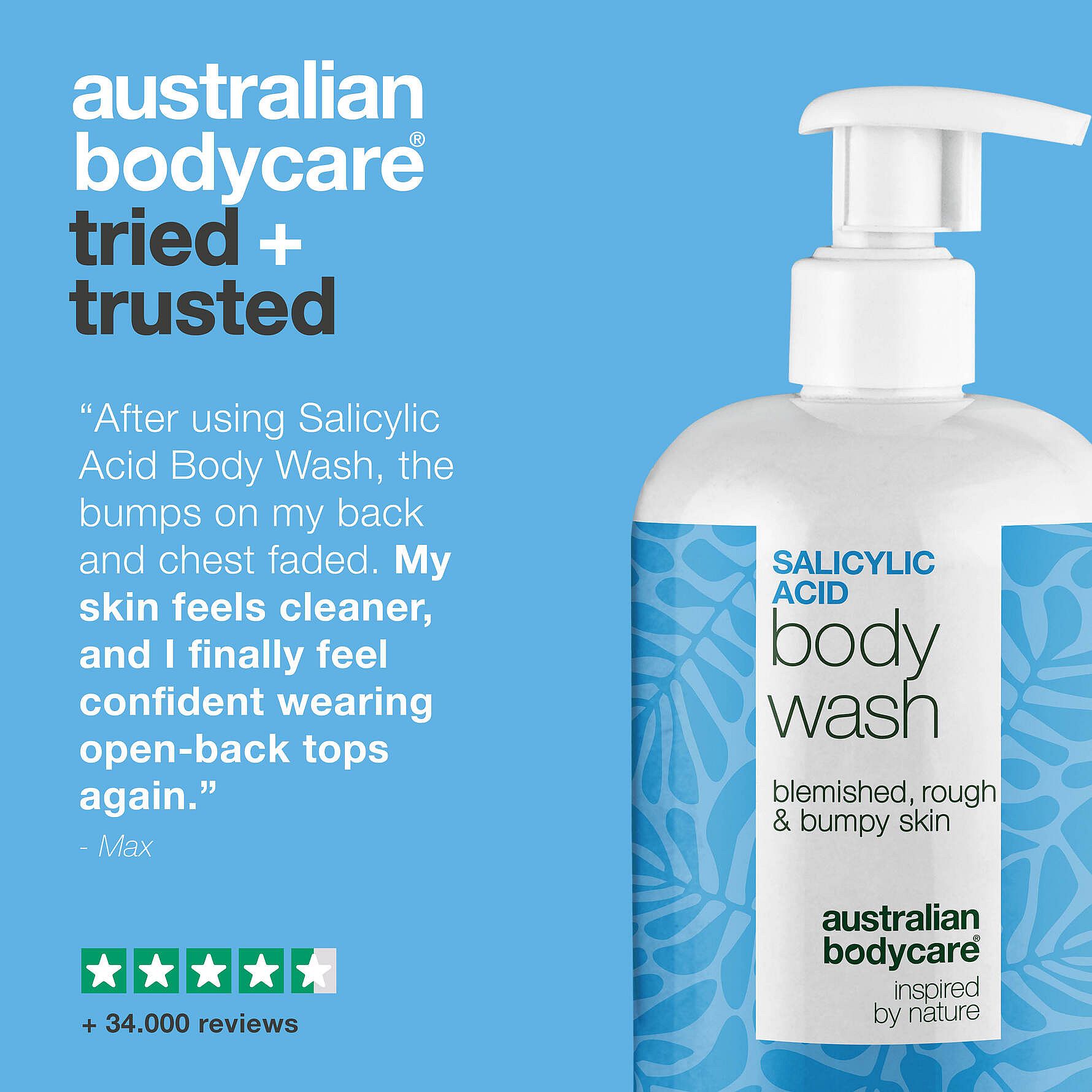 Salicylic Acid Body Wash från Australian Bodycare är framtagen för att användas dagligen på hud som lätt får finnar på kroppen – särskilt på ryggen, rumpan, bröstet och axlarna.