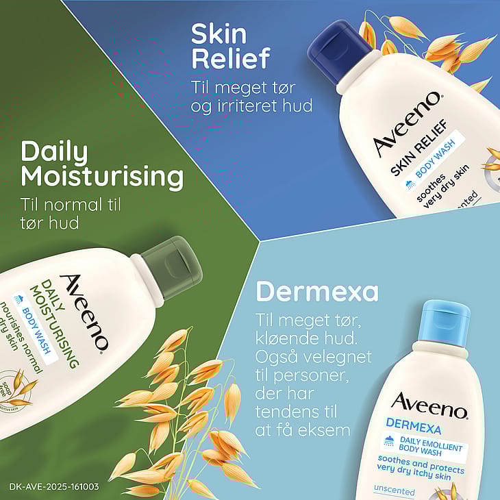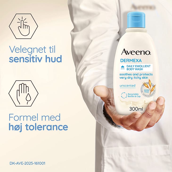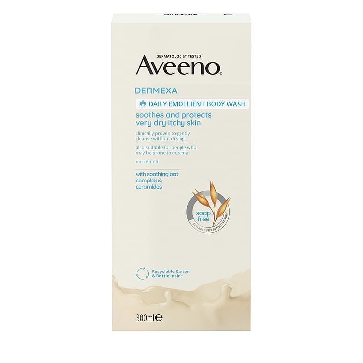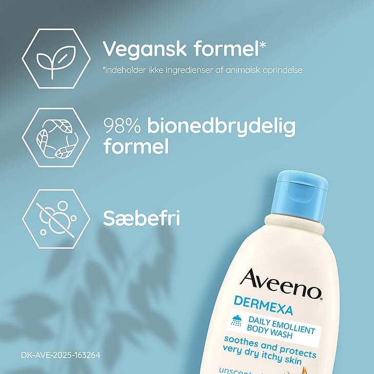 Aveeno® Dermexa Daily Emollient Body Wash 300 ml, oparfymerad rengöring för kroppen som är fri från tvål, lugnar och skyddar mycket torr hud som kliar. Lämplig för känslig hud och även för personer som tenderar att få eksem. Denna kliniskt beprövade formula rengör varsamt utan att torka ut huden och gör att huden känns återfuktad och lugnad. När Aveeno® Dermexa Daily Emollient Body Wash, med lugnande havrekomplex (havremjöl + havreextrakt) och ceramider, används som en del av en hudvårdsrutin hjälper de till att förbättra balansen i hudens naturliga mikrobiom för en mer motståndskraftig hud som ser hälsosam ut från dag 1. Lämplig för barn över 3 år och vuxna.