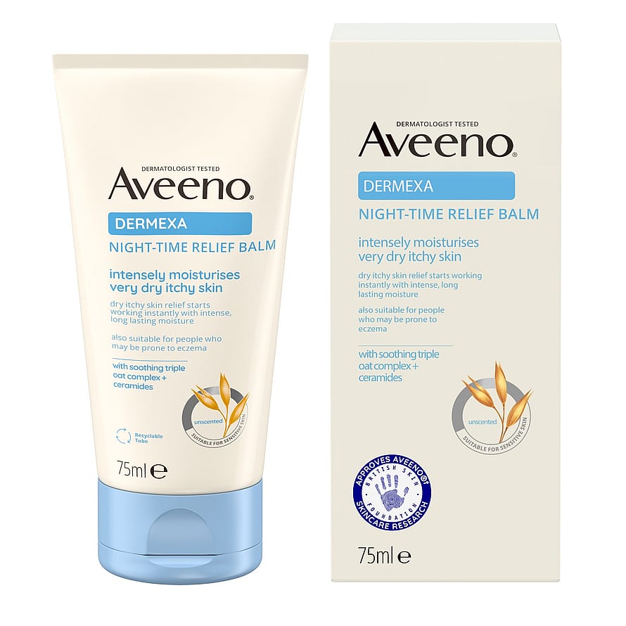 Aveeno® Dermexa Fast & Long Lasting Balm 75 ml, oparfymerad balm för mycket torr hud, även lämplig för personer som tenderar att få eksem. Lugnar och lindrar omedelbart kliande orsakat av torr hud. För att lindra besvären, återfuktar denna kliniskt bevisade formula intensivt för att minska kliandet direkt och upp till 6 timmar. Med lugnande trippel havrekomplex (havremjöl + havreextrakt + havreolja) och ceramider hjälper den till att bevara hudens naturliga balans och återställer hudbarriären för en hud som ser hälsosam ut och är mer motståndskraftig från dag 1. Lämplig för spädbarn, barn och vuxna.