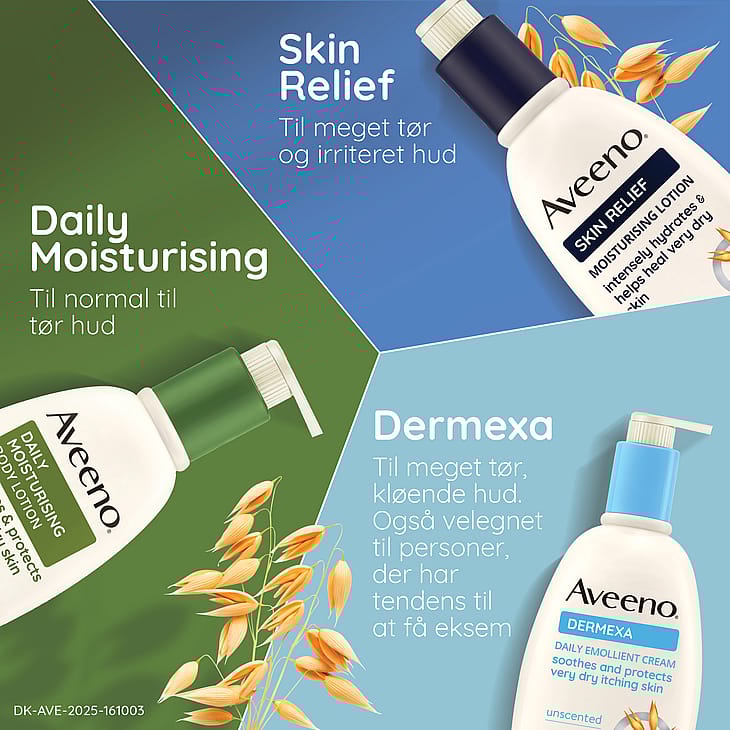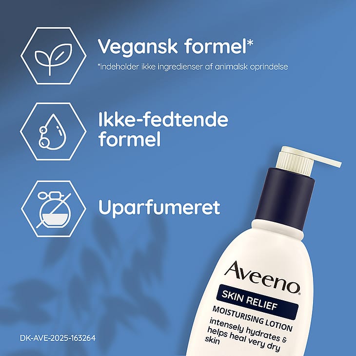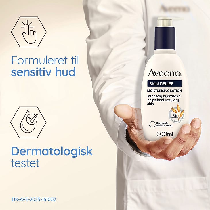 Aveeno® Skin Relief Moisturising Lotion 300 ml, oparfymerad lotion som lugnar och återfuktar mycket torr och irriterad hud, även lämplig för känslig hud. Kliniskt bevisad att återfukta huden i upp till 72 timmar* och att återställa den naturliga hudbarriären. Rik, snabbabsorberande och kladdfri formula som är kliniskt bevisad att återfukta och effektivt lugna mycket torr, irriterad eller känslig hud. Formulerad med lugnande trippel havrekomplex (havremjöl + havreextrakt + havreolja) som hjälper till att förbättra balansen i hudens naturliga mikrobiom. Gör huden mer motståndskraftig och den ser hälsosam från dag 1. Innehåller även sheasmör.