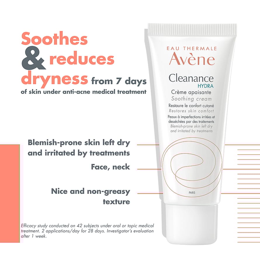 Avène Cleanance Hydra Cream är en ansiktskräm för känslig, torr och oren hud. Den är anpassad för att använda efter aknebehandling, om huden blivit torr och känslig. Krämen lugnar samt mjukgör huden och ger den långvarig återfuktning. Lätt parymerad.