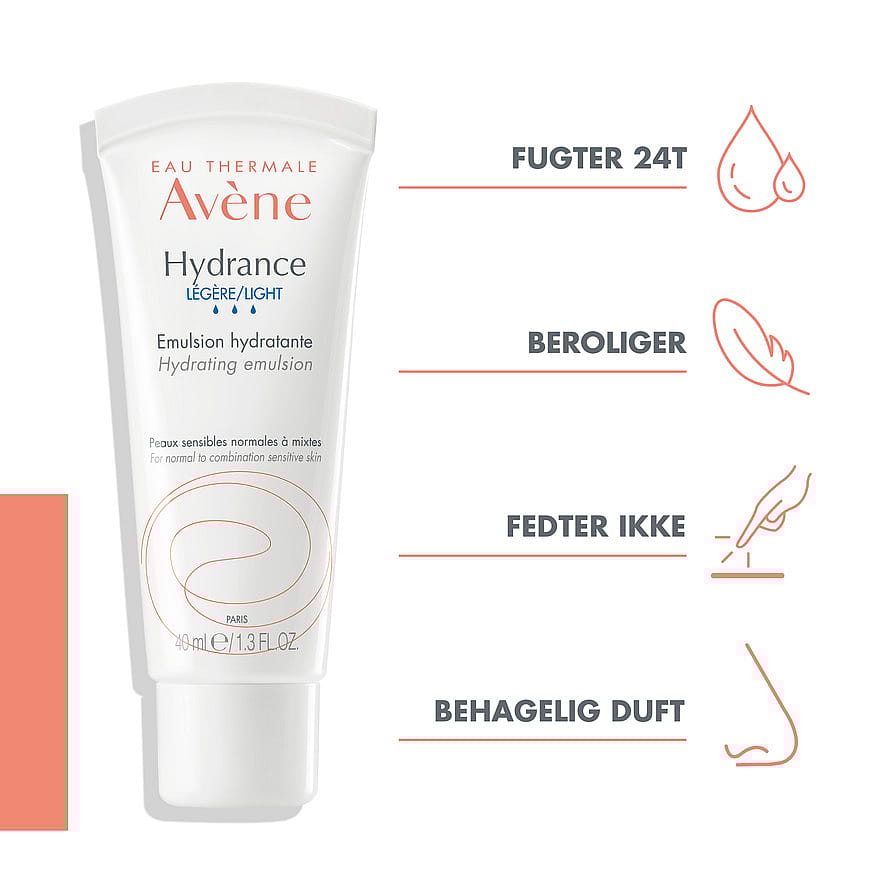 Avène Hydrance Light Hydrating Emulsion är en ansiktskräm för känslig, normal eller kombinerad hud. Krämen ger huden långtidsverkande återfuktning, med en daglig boost av Avène Thermalvatten. Den lugnar och mjukgör huden och hjälper till att återuppbygga hudens barriär. Hudkrämen mattar ned feta partier av huden, samtidigt som den återfuktar och vårdar. Lätt parfymerad.