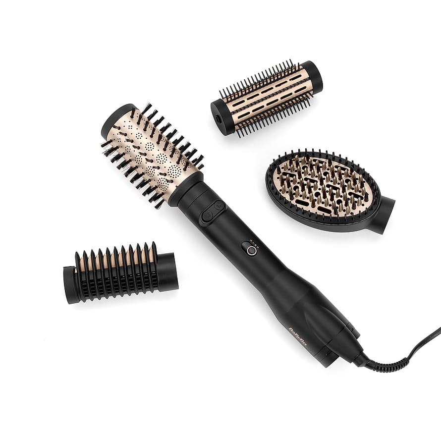 Roterande varmluftsborste med flera olika stylingtillbehör som ger ett perfekt, salongsfönat resultat.