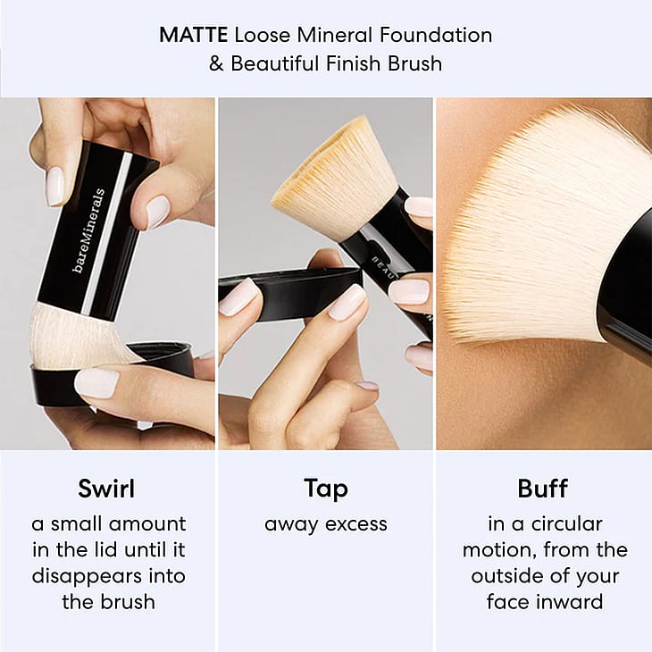 Borsta en liten mängd foundation i locket tills den försvinner in i borsten. Tappa bort eventuellt överflödigt puder. Applicera försiktigt på huden i cirkulära rörelser. Detta aktiverar mineralerna och förvandlar dem från puder till en silkeslen kräm. Upprepa tills du har uppnått önskad täckning, från lätt till full.