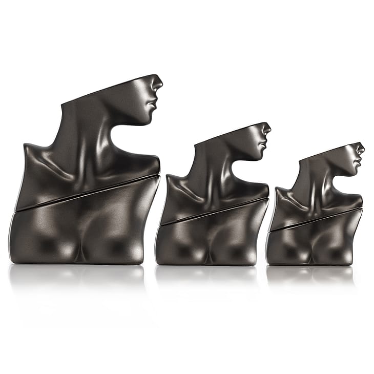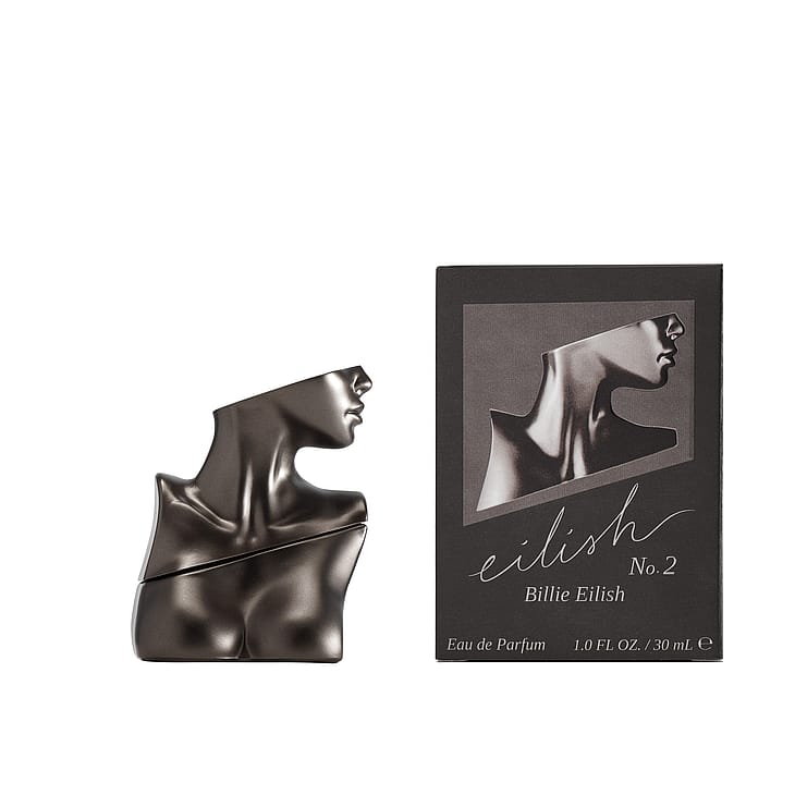 Flaskan är, precis som originaldoften, inspirerad av Billies favoritdelar på kroppen: dekolletaget, halsen och nyckelbenen – men här i en metallisk, mörkgrå nyans.