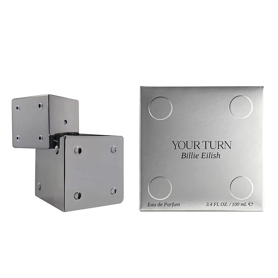 Flaskan till Your Turn är inspirerad av Billies intresse för inredning och personliga uttryck. Den är formad som två staplade tärningar med präglade prickar. Flaskans stilrena, minimalistiska linjer och silverkromfinish gör den till ett modernt konstverk, som ger ett både lekfullt och spännande intryck och speglar doftens djärva och fängslande karaktär.