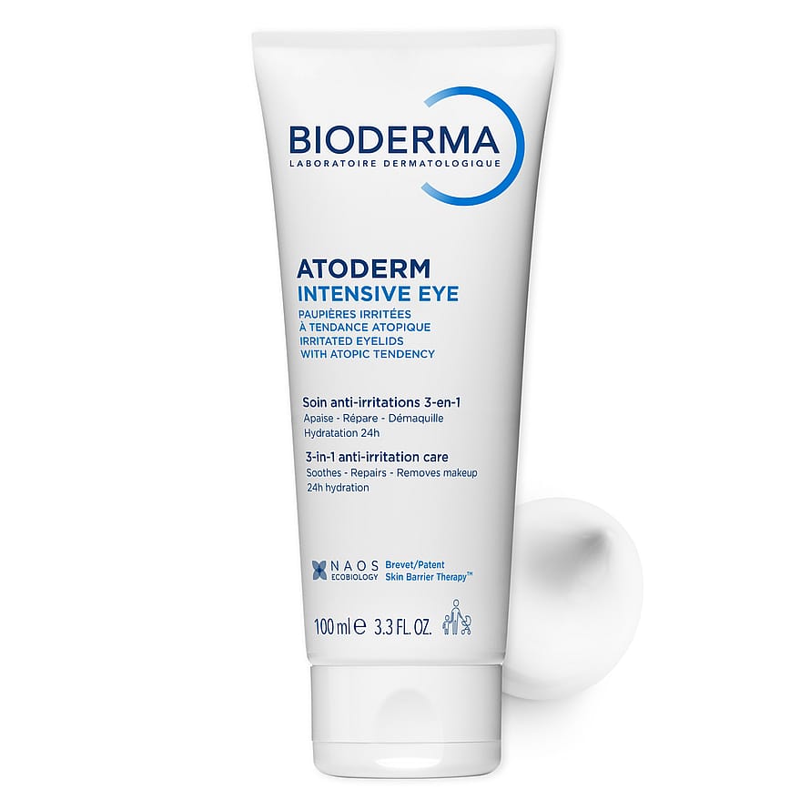 Atoderm Intensive Eye är en daglig 3-i-1-produkt som lugnar mycket torra, känsliga och atopiska ögonlock, stärker hudbarriären och avlägsnar makeup, smuts och föroreningar i en enda, skonsam applicering. Den fungerar både som ögonkräm och rengöring och är framtagen för att minska friktion och antalet produkter i det känsliga ögonområdet. Formulan kombinerar Lipigenium™-teknologi, som hjälper till att stödja lipidproduktionen och stärka barriären, med Skin Barrier Therapy™, som skyddar huden mot yttre påfrestningar. Tre rengörande oljor avlägsnar makeup och orenheter på ett skonsamt sätt. Huden känns lugnare och mer återfuktad efter användning, och produkten hjälper till att minska torrhet, stramhet och obehag över tid. Återfuktningen kan vara i upp till 24 timmar. Produkten kan användas dagligen av vuxna, barn och spädbarn (ej prematura) och passar för både ansikte, ögonlock och ögonområde. Den är oparfymerad, har mycket hög hud- och ögontolerans och passar även kontaktlinsbärare. Kan användas ensam eller tillsammans med glukokortikoider.