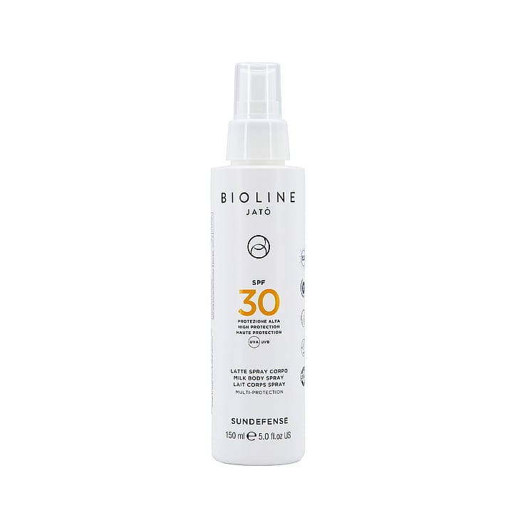 Sundefense Spf 30 High Protection Milk Body Spray Multi-Protection är en solskyddsfaktor med högt skydd mot blått ljus IR-, UVA- och UVB-strålning. Sundefense Milk Body Spray innehåller ett bredspektrum solfilter som skyddar huden mot att bränna dig av solens strålar. Sprayen är vattenresistent och snäll mot den marina miljön i haven. Cremen är lätt i konsistensen och passar perfekt för de som befinner sig ute mycket och gillar att bada. Bioline Jatò kombinerar vetenskap med naturliga extrakt för att skapa mycket effektiva och hudvänliga solskydd.