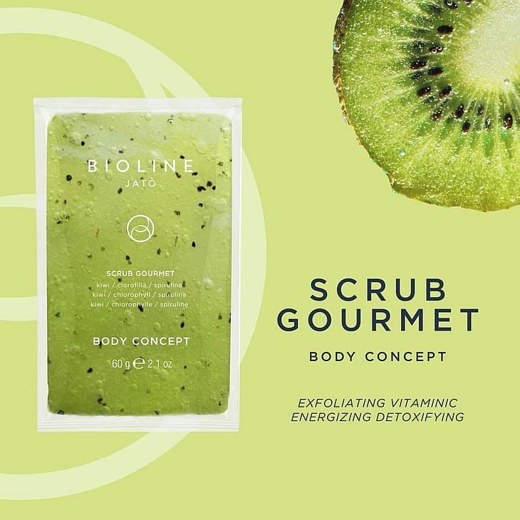 Scrub Gourmet är en mycket behaglig geleig body scrub som är rivig och verkar detoxande för huden. Rik på antioxidanter från bland annat kiwifrön som också verkar exfolierande tillsammans med havssalt och socker som effektivt exfolierar bort döda hudceller. Klorofyll är rikt på A-vitamin, C-vitamin, E-vitamin och K-vitamin som berikar huden med antioxidanter och hjälper den att skydda sig mot yttre påfrestningar som fria radikaler och solens negativa påverkan. Spirulina dränerar ur orenheter och djuprengör huden samtidigt som även den berikar huden med antioxidanter. Scrub Gourmet gör huden mjukare, renare och fräschare samt spänstigare och mer motståndskraftig. Perfekt för de som har knottror på huden, inväxta hårstrån eller för den som lätt får blemmor på kroppen. Texturen är mycket behaglig och ger en härlig upplevelse i duschen.