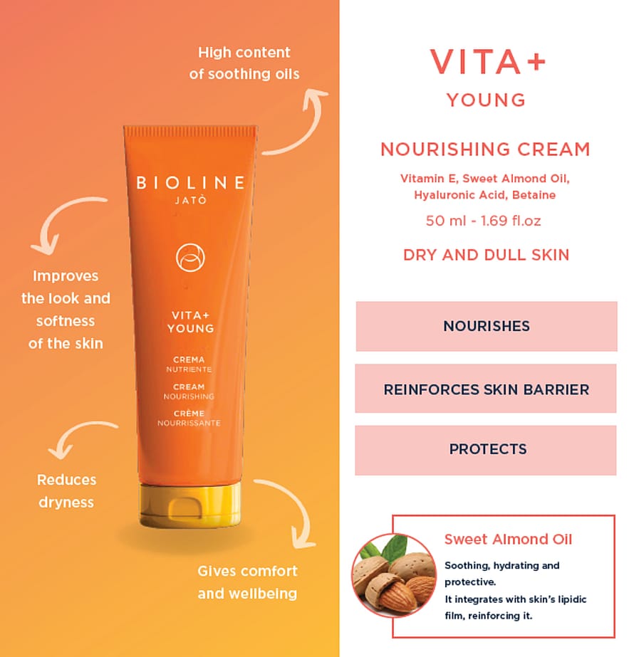 VITA+ YOUNG är en närande 24h creme för tonåringar med torrare hud och som har behov av vårdande och närande ingredienser. I cremen finner vi sötmandelolja som är återfuktande och fuktbindande på huden samtidigt som vitamin E bidrar med antioxidanter som skyddar huden. Vi har också en fillaggrin booster som är kombinerad av soja, vetegroddar och olivträd för att verkligen stärka barriären och stimulera hudens egen produktion av fillaggrin. Vilket är en nödvändig funktion i vår hud som gör att huden håller ihop och är motståndskraftig.