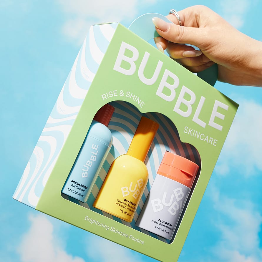 Bubble’s Rise and Shine Brightening Kit ger dig en daglig dos av lyster med en 3-stegs rutin. Våra bästsäljande produkter Fresh Start, Day Dream och Cloud Surf arbetar tillsammans för att främja strålande och balanserad hud – så att du kan starta dagen lika lysande som DU.