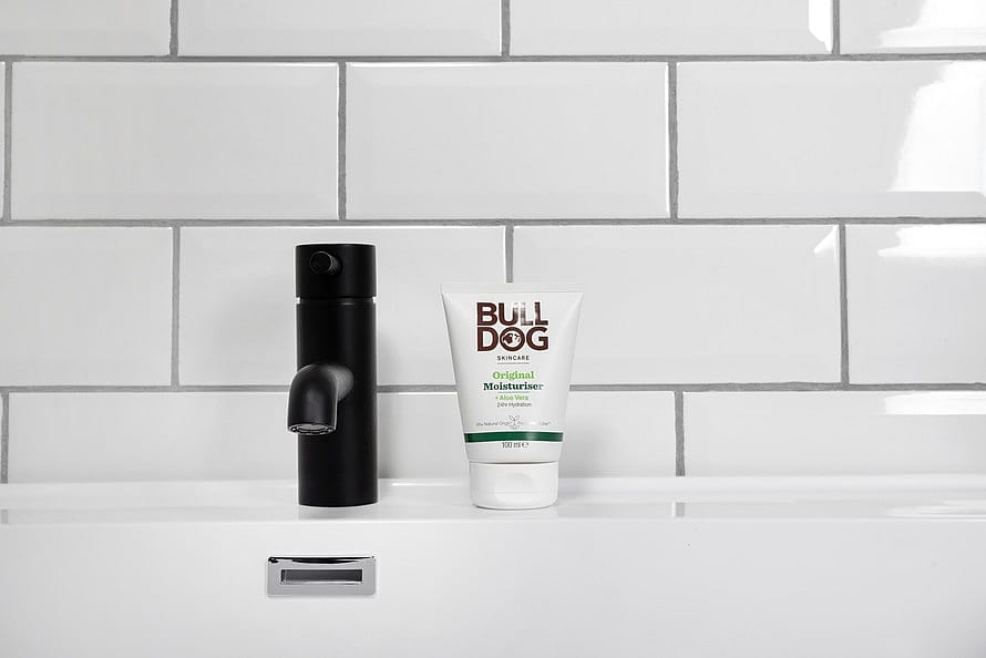 Bulldog rekommenderar en hudvårdsrutin bestående av ansiktstvätt, ansiktsskrubb och fuktighetskräm.