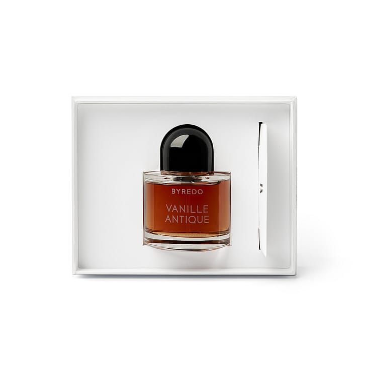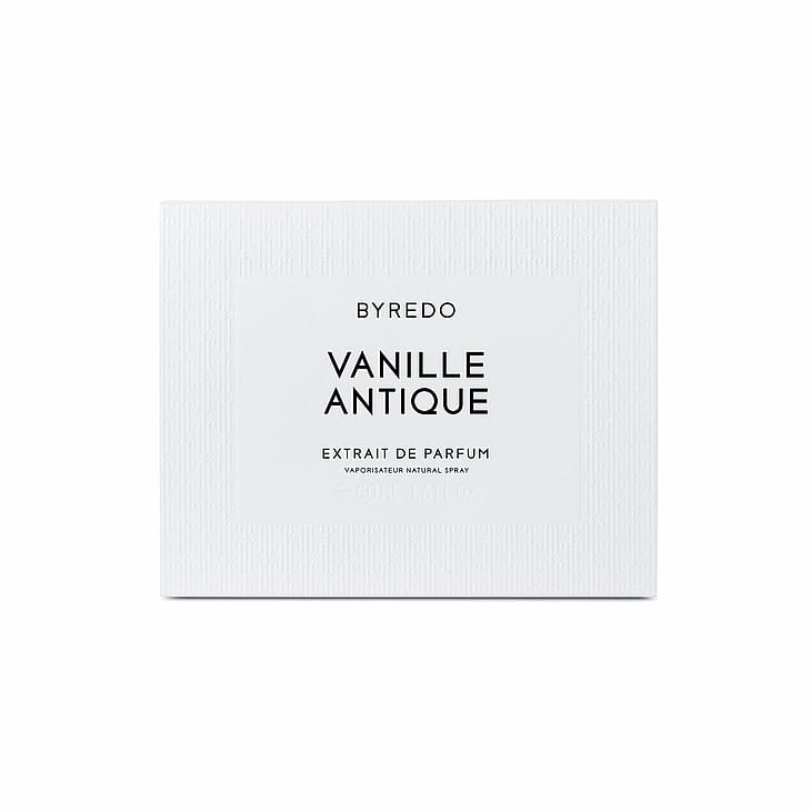 Vanille Antique är den första titulära Byredo-doften centrerad kring parfymeriets sällsynta råvara. Här blir den rökiga doften av vaniljstång laddad med historia och karaktär; förvandlas till något oväntat, mindre sirapsliknande och mer nyanserat. Vaniljens förväntade sötma skärs igenom av texturer av jordighet och mörker, en värmande blandning av cashmeran trä, cistus blomman och mysk bildar en berusande ambrosia.