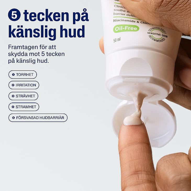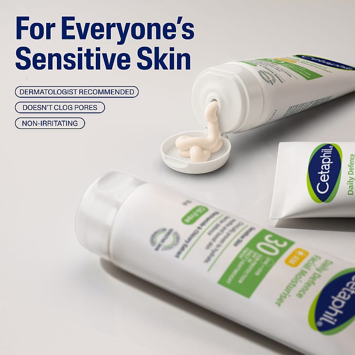 Cetaphil Daily Defence Facial Moisturiser SPF 30 är en lätt ansiktskräm med ett avancerat UVA + UVB-skydd och niacinamid- och cikoriaextrakt-komplex som hjälper till att skydda mot fem tecken på känslig hud; försvagad hudbarriär, torrhet, irritation, strävhet och stramhet.