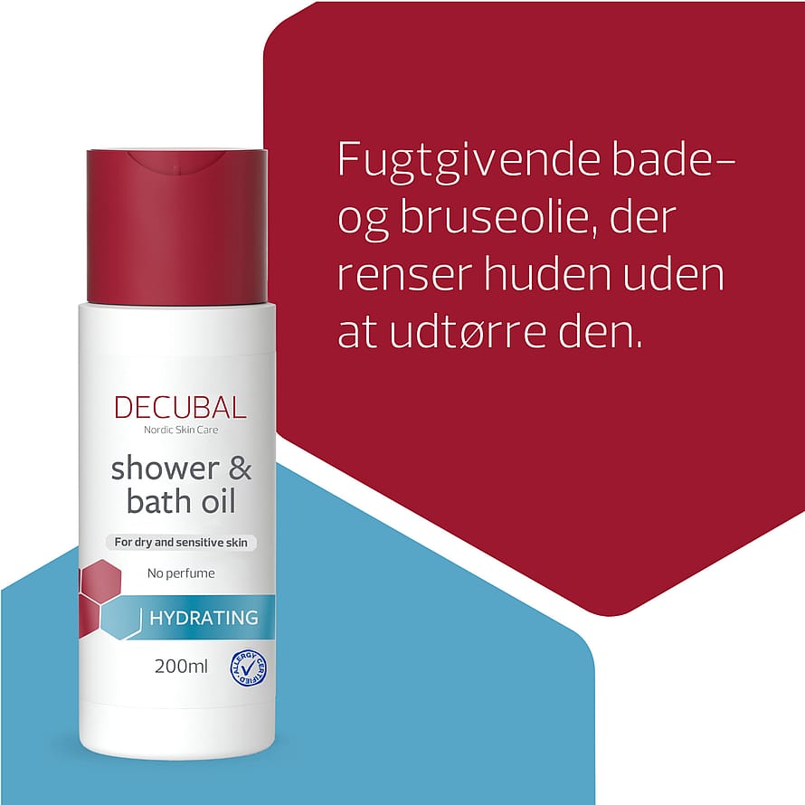 Decubal Hydrating shower & bath oil verkar återfuktande och rengör huden skonsamt utan att torka ut den. Innehåller E-vitamin, naturliga oljor och kamomill som lugnar och mjukgör huden samtidigt som den skyddar den naturliga hudbarriären. Vår återfuktande dusch- och badolja är oparfymerad och allergicertifierad vilket gör den lämplig även för känslig hud.