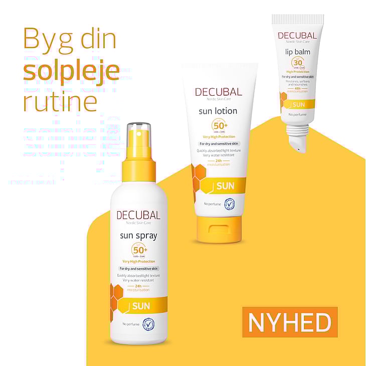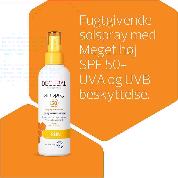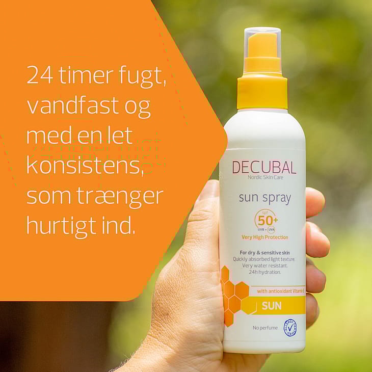 Decubal Sun Spray SPF50+ ger ett högt, bredspektrigt skydd mot UVA- och UVB-strålar i ett praktiskt sprayformat. Formuleringen som är berikad med bland annat vitamin E och avokadoolja har en kliniskt bevisad återfuktande effekt i upp till 24 timmar, samtidigt som den stärker hudens barriär. Närande men ändå lätt i konsistensen och snabbabsorberande. Decubal Sun Spray som är utvecklad för att skydda även den torraste och mest känsliga huden, är även dermatologiskt testad och allergicertifierad.