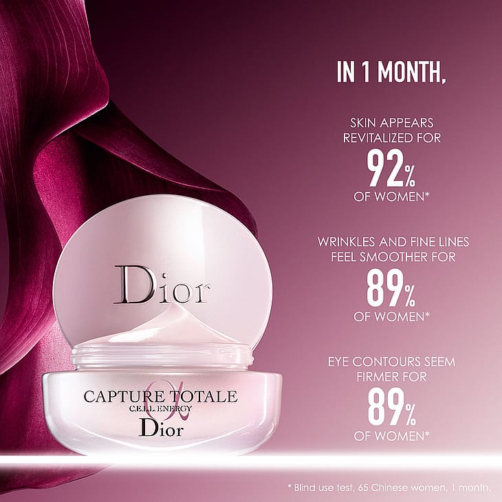 4 Energi, regenerering, självreparation, läkning och cellproduktion samt melaninhämning. Med hjälp av denna åldersutmanande ögonkräm mot mörka ringar verkar ögonkonturen omedelbart återupplivad, befriad från tid, stress och trötthet. Intensivt utjämnad och fast, ögonområdet verkar vaket och ljust, dag efter dag. Denna balsam med struktur som en "andra hud" är perfekt anpassad för det känsliga och utsatta ögonområdet. Dior Capture Totale är den unika kombinationen av Diors stamcellsforskning och expertis kring blommor. Genom att fånga livskraften hos fyra exceptionella blommor (Longoza från Dior Gardens, pion, vit lilja och jasmin), återställer Diors patenterade2 Bio-Cellular TechnologyTM den energiska kraften3 hos de dyrbara stamcellerna. De kombineras med nästa generations vektor för att öka upptaget i huden med 30 %. Formeln är berikad med fytosteroler som riktar in sig på mörka ringar och återställer huden.