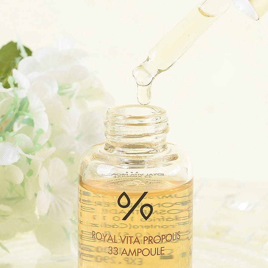 Royal Vita Propolis 33 Ampoule är en multifunktionell lystergivande serum-ampull som ger ger näring och fukt på djupet. Den innehåller 33% ren propolis som är naturligt reparerande, extrakt av bidrottninggelé skyddar huden från fria radikaler och havtornextrakt som har uppljusande effekt på pigmenteringar. Den lugnar även huden med panthenol och niacinamid minskar fina linjer och ojämn hudton. Passar alla hudtyper, speciellt en känslig och acnebenägen hud. Lystergivande serum-ampull. Ger näring och fukt på djupet. Innehåller 33% propolis och bidrottninggelé.