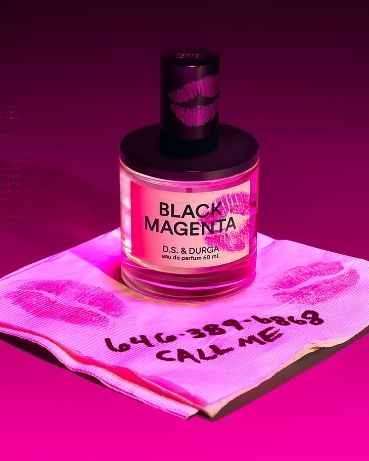 Black Magenta doftar rosa ananas, grön galbanum och svartpeppar, som övergår i iris, apelsinblom och ett magentafärgat blomdunk.