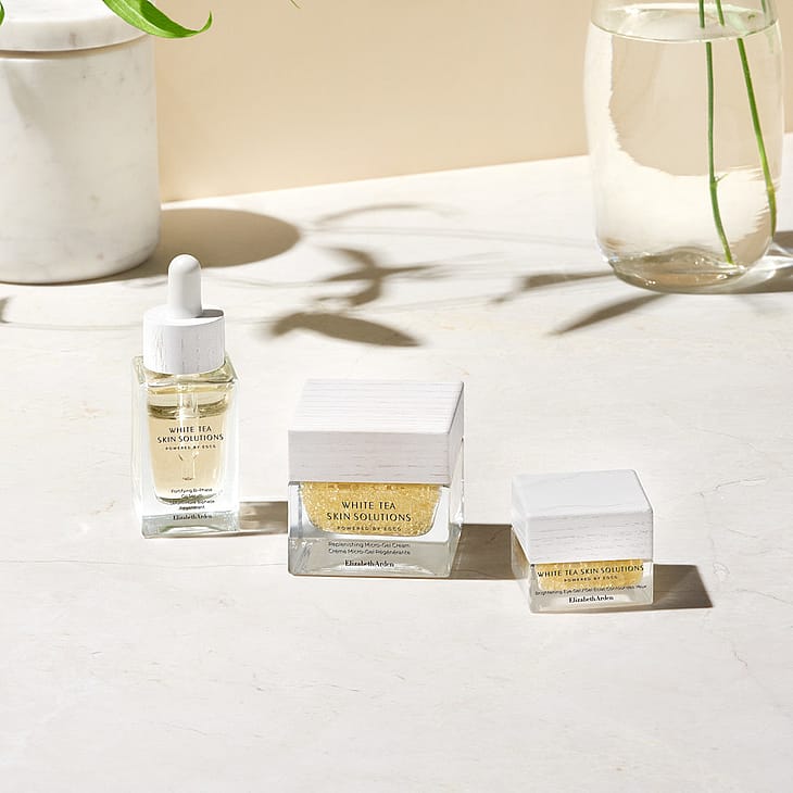 White Tea Skin Solutions är en vegansk hudvårdsserie från Elizabeth Arden som skapats med naturens potenta antioxidant EGCG som finns i vitt te, för att ge huden ungdomlig vitalitet och för att stärka hudens försvarskraft. Varje formula är noga utformad med EGCG, bioteknik för att stärka det naturliga kollagenet i huden på bara 6 timmar.
