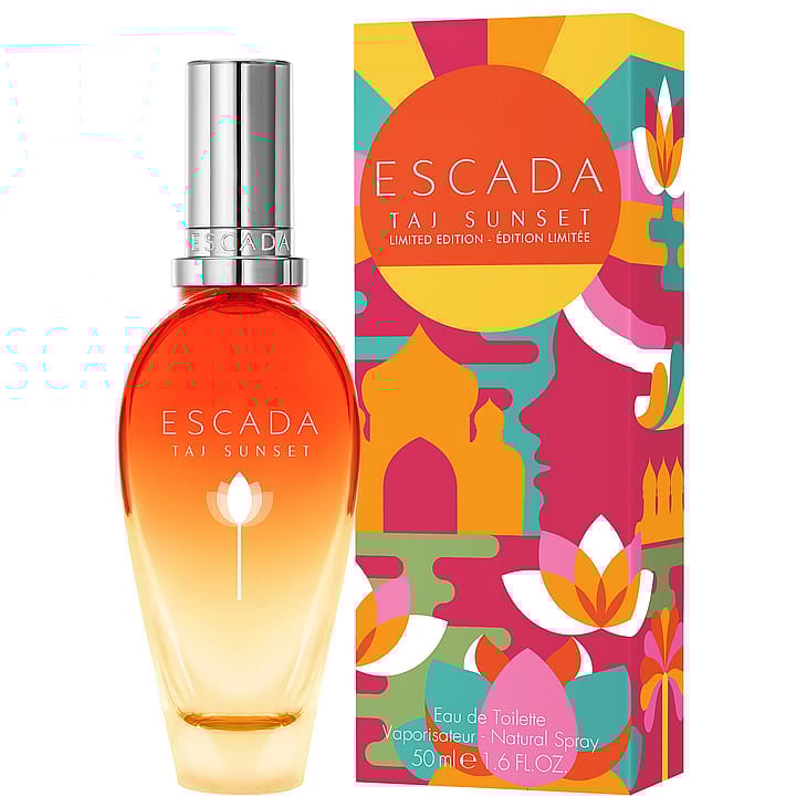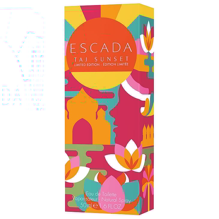 Förpackningen på denna limited edition Escada blomsterdoft tar dig till en perfekt solnedgång över Taj Mahal. Genom att återskapa glädjen från den färgglada Holi-festivalen, är den feminina glasflaskan prydd med en elegant vit lotus och avslutad med en orange gradient som påminner om solnedgångar.