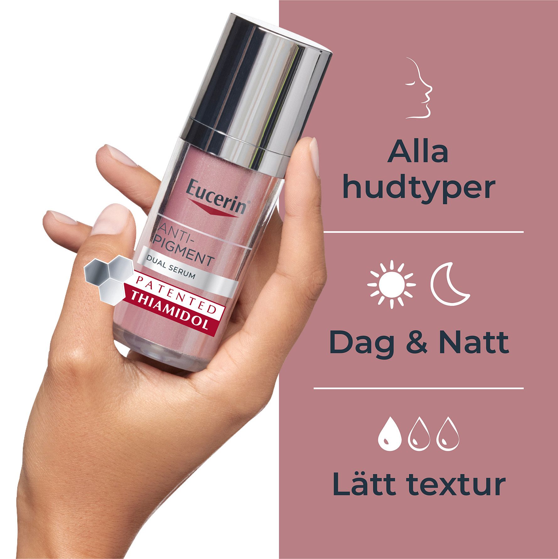 *Använd tillsammans med Anti-Pigment Cleansing Gel. Klinisk studie under 4 veckor med 64 användare som använde Anti-Pigment Cleansing Gel och Dual Serum