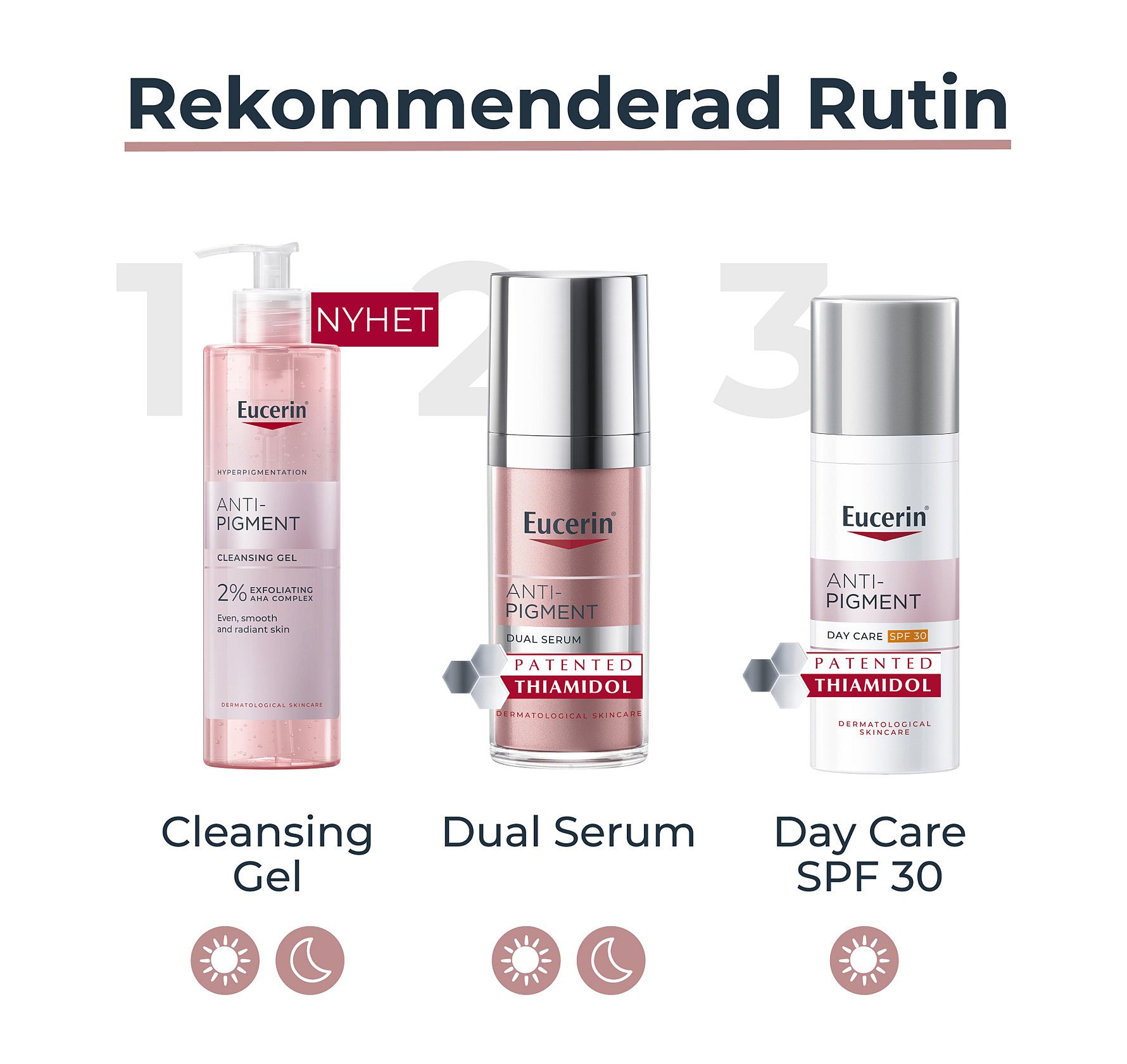 Eucerin Anti-Pigment Cleansing Gel + Dual Serum Gift Set är den perfekta duon för att effektivt minska mörka fläckar för att få en jämnare hudton. Kombinationen av de två produkterna tillsammans ger en ännu mer effektiv behandling, där de första resultaten syns redan inom 1 vecka*. Rengöringsgelen är exfolierande med 2% AHA komplex. Serumet innehåller patenterad Thiamidol® som reducerar alla typer av mörka fläckar** och förhindrar att de återkommer vid regelbunden användning. Thiamidol® är effektivt på alla hudtoner. Det absorberas snabbt in i huden och kladdar inte. God hudvänlighet på alla hudtyper, även känslig hud.