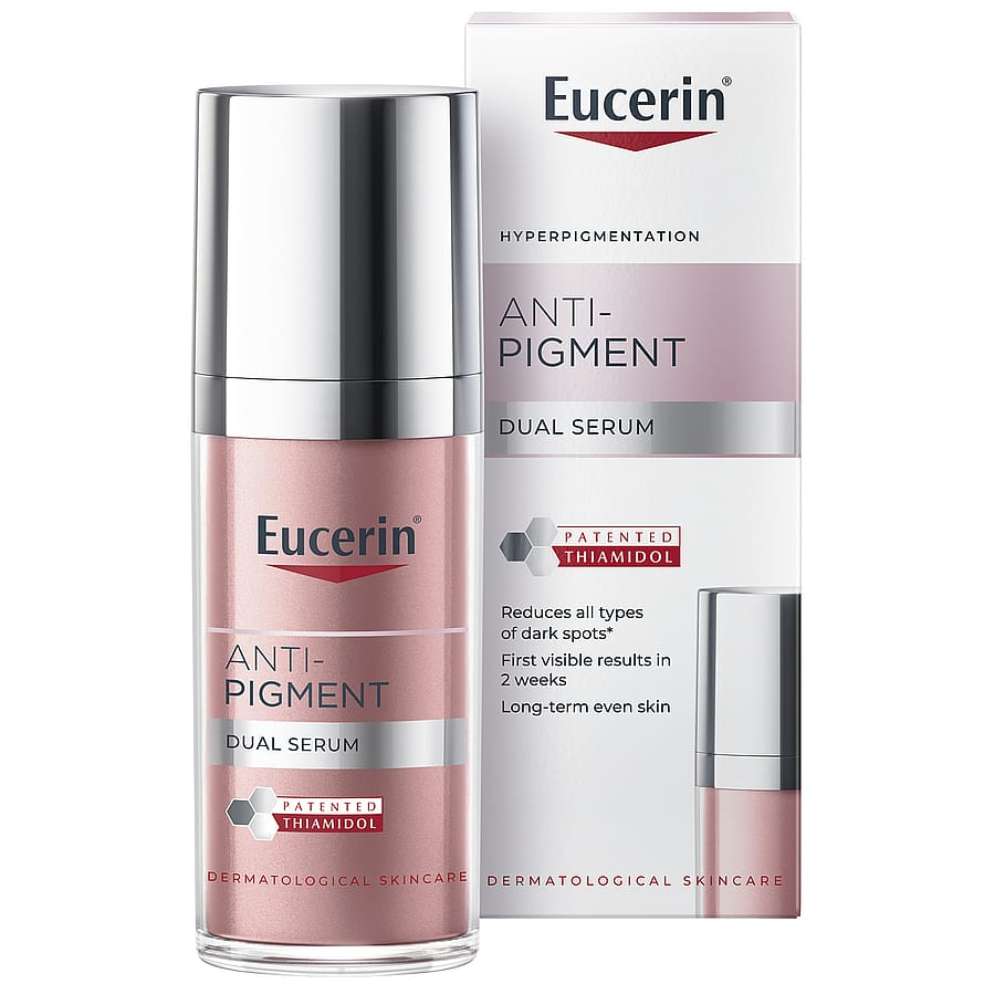Serumet innehåller den patenterade ingrediensen Thiamidol®, som förebygger och reducerar mörka fläckar. Med första synliga resultat inom en vecka vid användning tillsammans med Eucerin Anti-Pigment Cleansing Gel. Formulan med Hyaluronsyra hjälper till att släta ut fina linjer och rynkor, vilket ger huden ett ungdomligt och fräscht utseende. Med regelbunden användning upprätthåller Eucerin Anti-Pigment Dual Serum en långvarigt jämn hudton och förbättrar hudens övergripande utseende. Resultatet är en synligt jämnare och klarare hudton, med första synliga resultat efter endast två veckor.