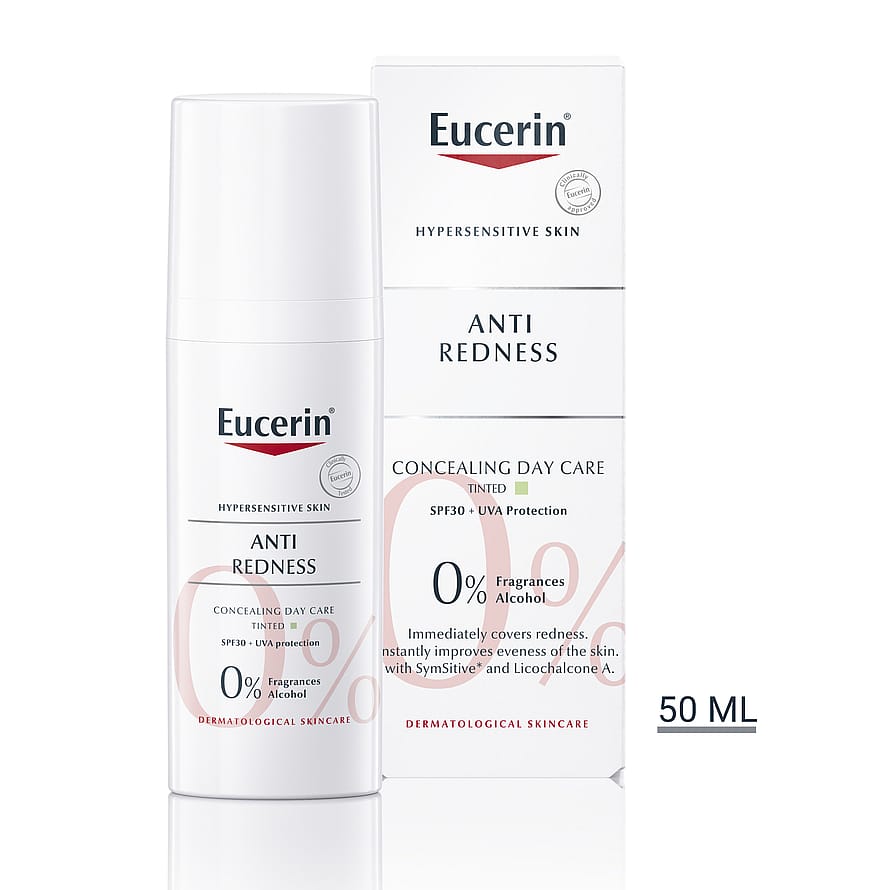 Eucerin AntiRedness Concealing Day Care Tinted SPF30 är en dagcreme med ljusgrönt täckande pigment som omedelbart neutraliserar rodnad på huden.