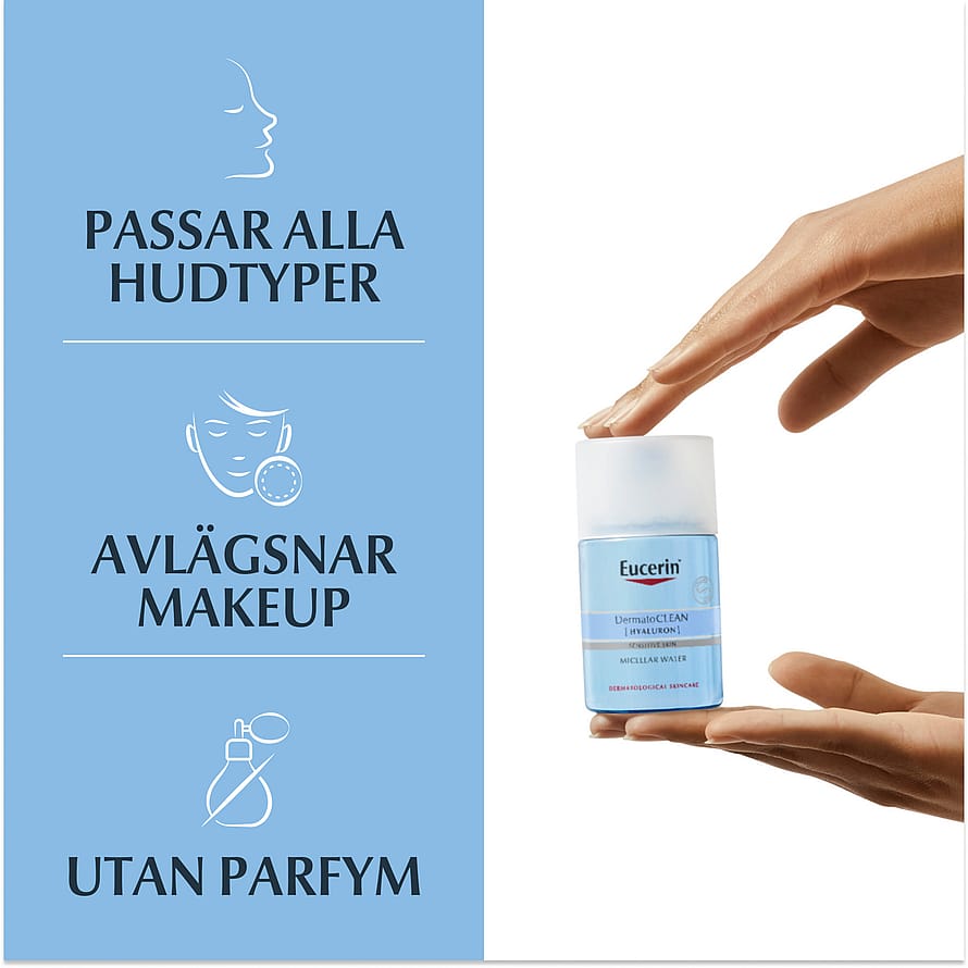 Denna produkt rengör grundligt och skonsamt, och avlägsnar orenheter och make-up från både ansiktet och ögonen. Formulan innehåller Hyaluronsyra och andra återfuktande ingredienser som säkerställer att huden inte torkar ut. Resultatet är en märkbart ren och mjuk hud. Produkten är utan parfym och är särskilt lämplig för känslig hud, inklusive huden runt ögonen. Eucerin DermatoClean Micellar Water 3in1 är idealisk för daglig användning och ger en fräsch och återfuktad känsla efter varje rengöring. Den är perfekt för att hålla huden ren och balanserad utan att orsaka irritation.