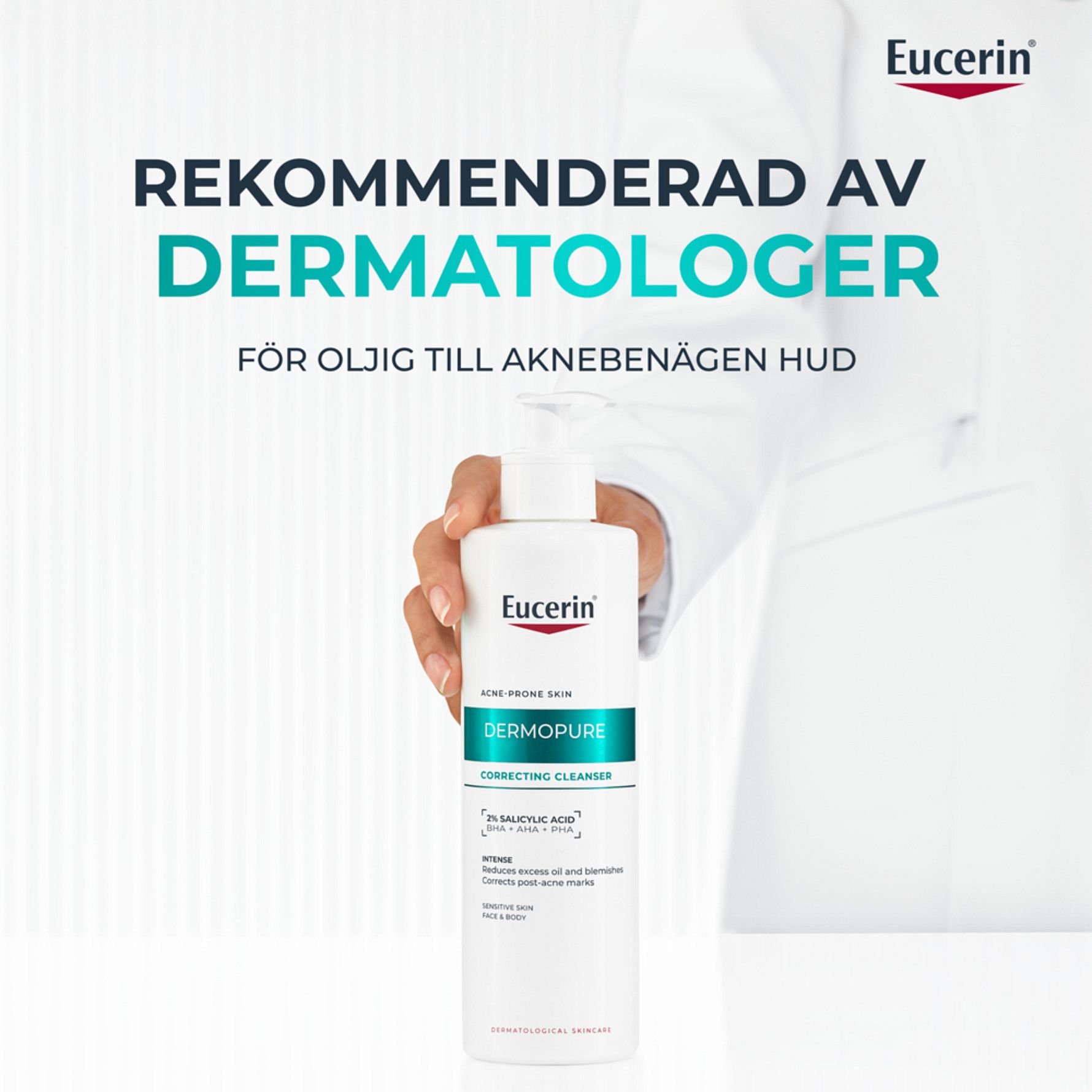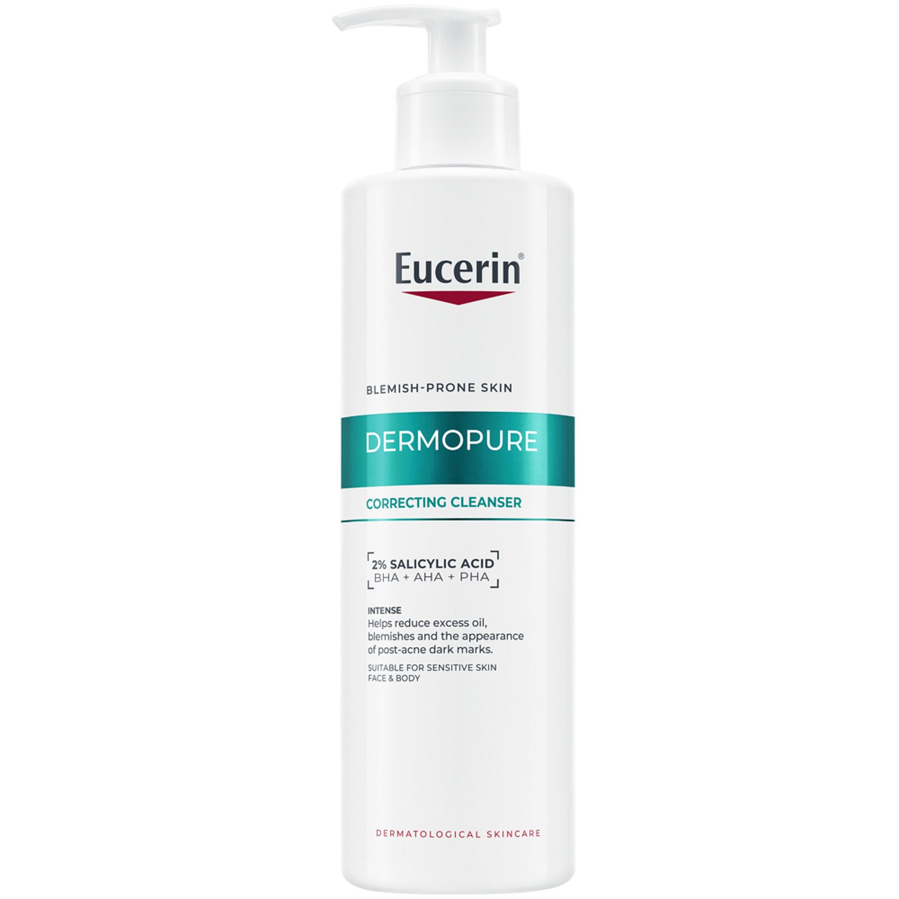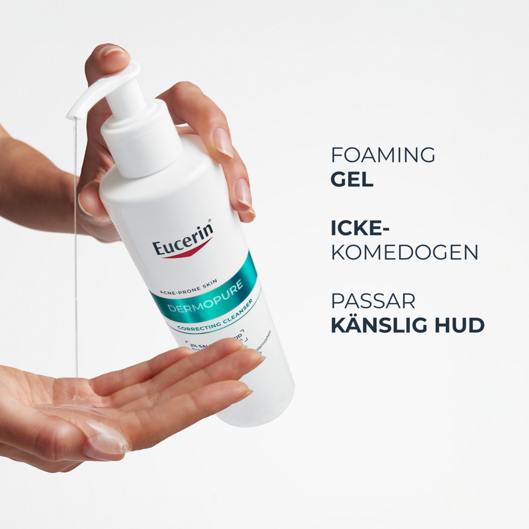 Eucerin Dermopure Correcting Cleanser är en intensiv rengöringsgel för oljig och aknebenägen hud på både ansiktet och kroppen. Den innehåller en serumkoncentration med 2% Salicylsyra (BHA), Glykolsyra (AHA) och Glukonolakton (PHA), som är kliniskt testad för att reducera finnar och akneärr, samtidigt som det hjälper till att stödja hudens mikrobiom. Effektiv från dag ett. Lämplig för känslig hud och från 12 år.