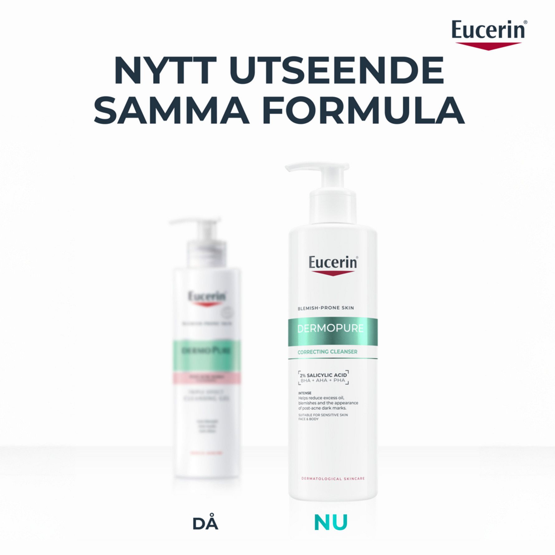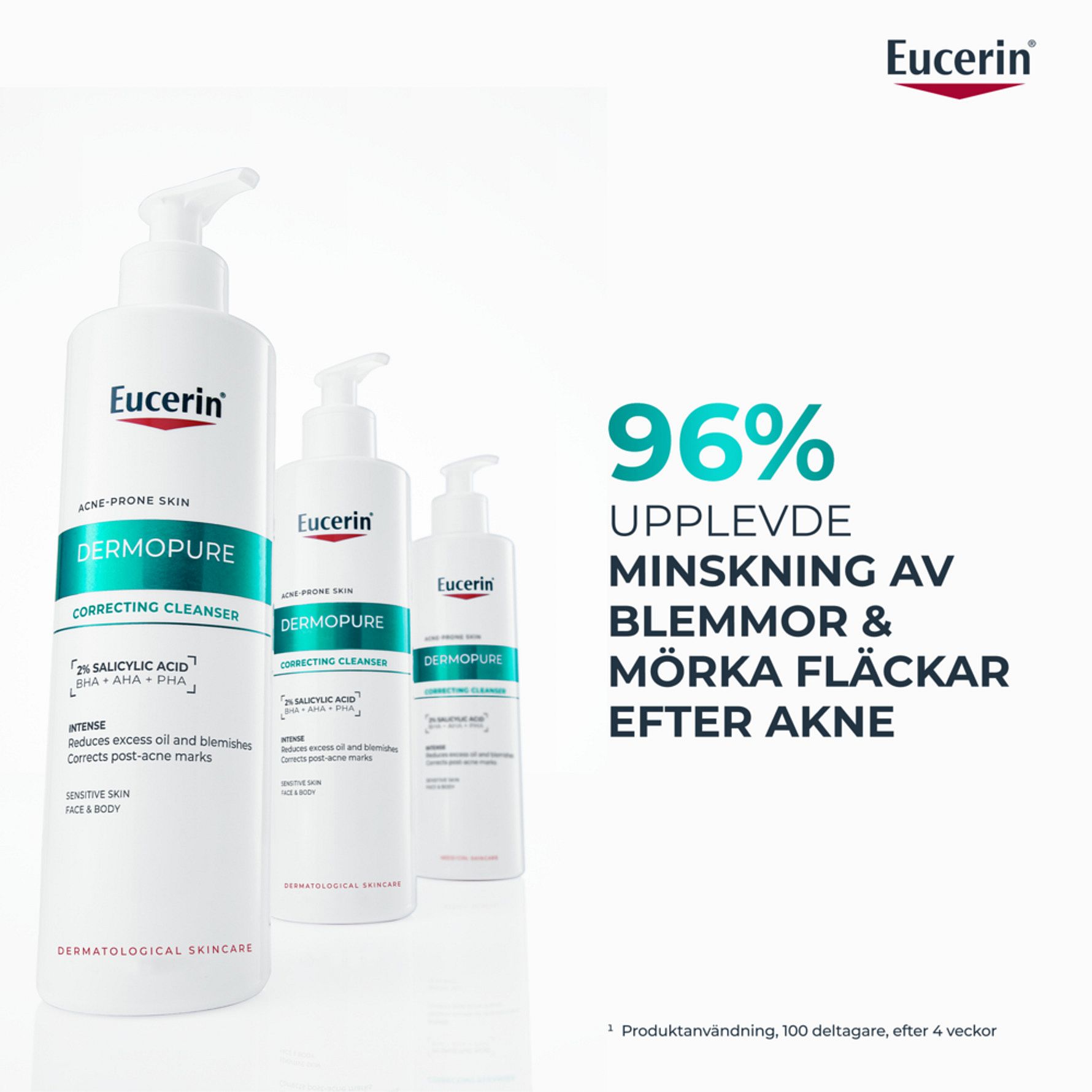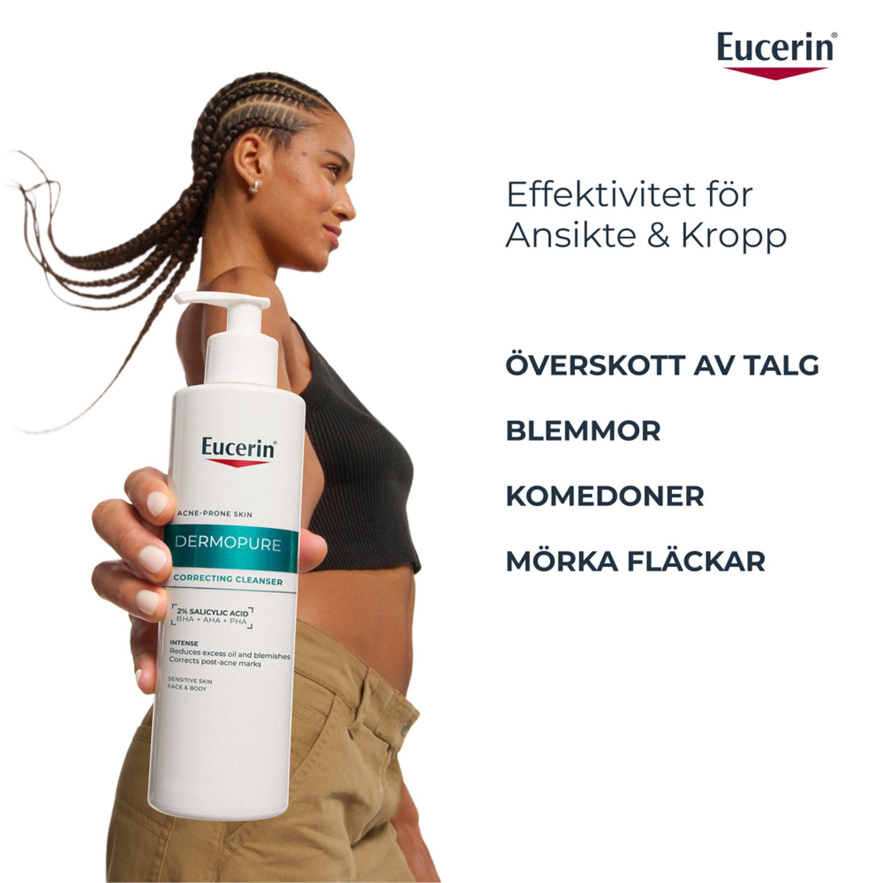 Eucerin Dermopure Correcting Cleanser är en intensiv rengöringsgel för oljig och aknebenägen hud på både ansiktet och kroppen. Den innehåller en serumkoncentration med 2% Salicylsyra (BHA), Glykolsyra (AHA) och Glukonolakton (PHA), som är kliniskt testad för att reducera finnar och akneärr, samtidigt som det hjälper till att stödja hudens mikrobiom. Effektiv från dag ett. Lämplig för känslig hud och från 12 år.