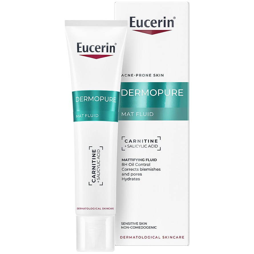 Eucerin Dermopure Mat fluid är en mattgörande ansiktscreme för aknebenägen och oljig hud. Den hjälper till att minska överskott av sebum (talg), minska synligheten av porer och blemmor, samt stödja hudens egna mikrobiom. Den har en mattgörande effekt som varar upp till 8 timmar och är effektiv från dag ett. Cremen är även återfuktande och passar känslig hud. Lämplig för alla hudtyper och från 12 år. Icke-komedogen.