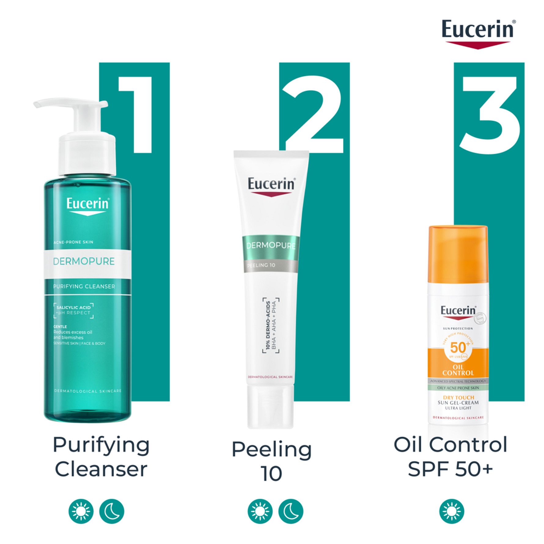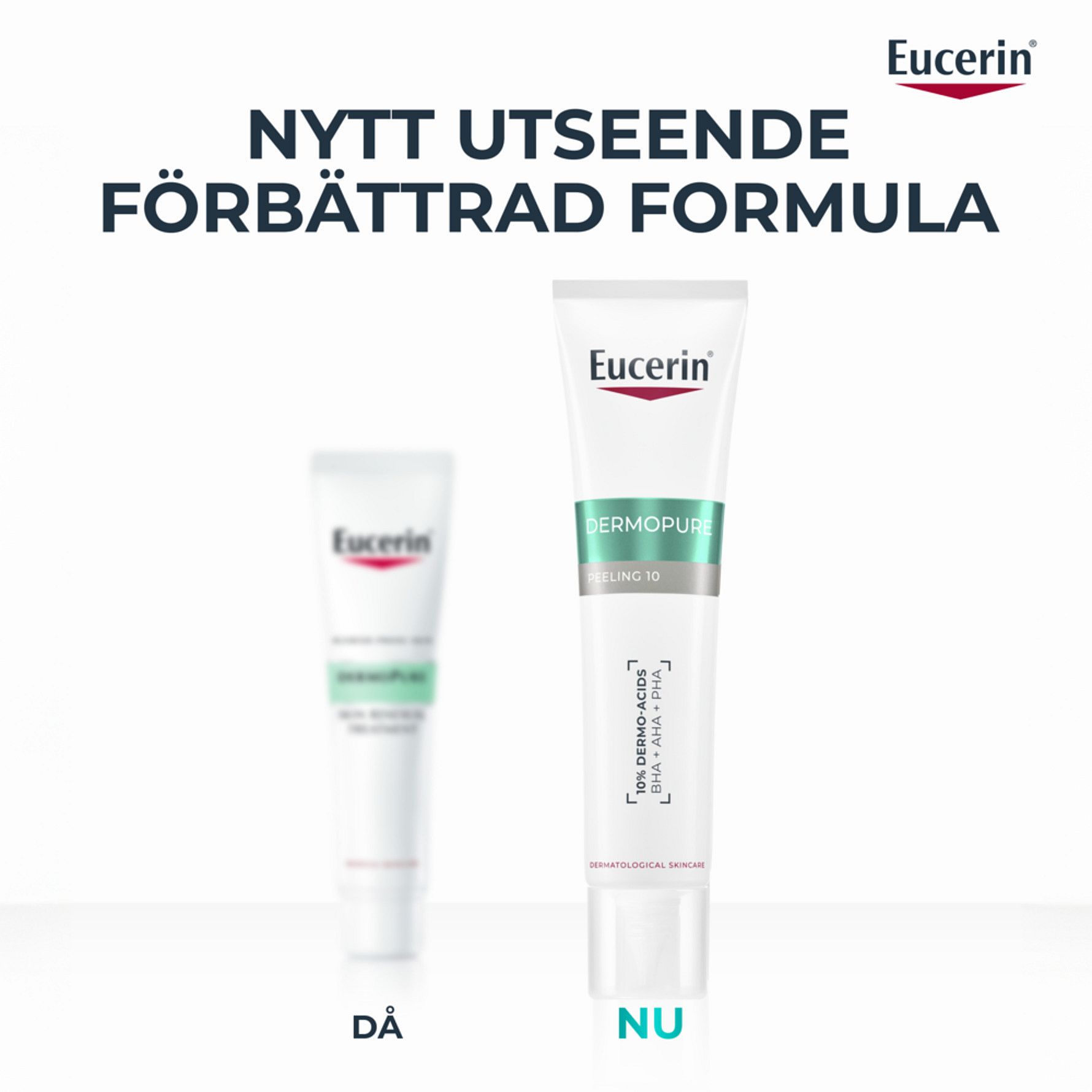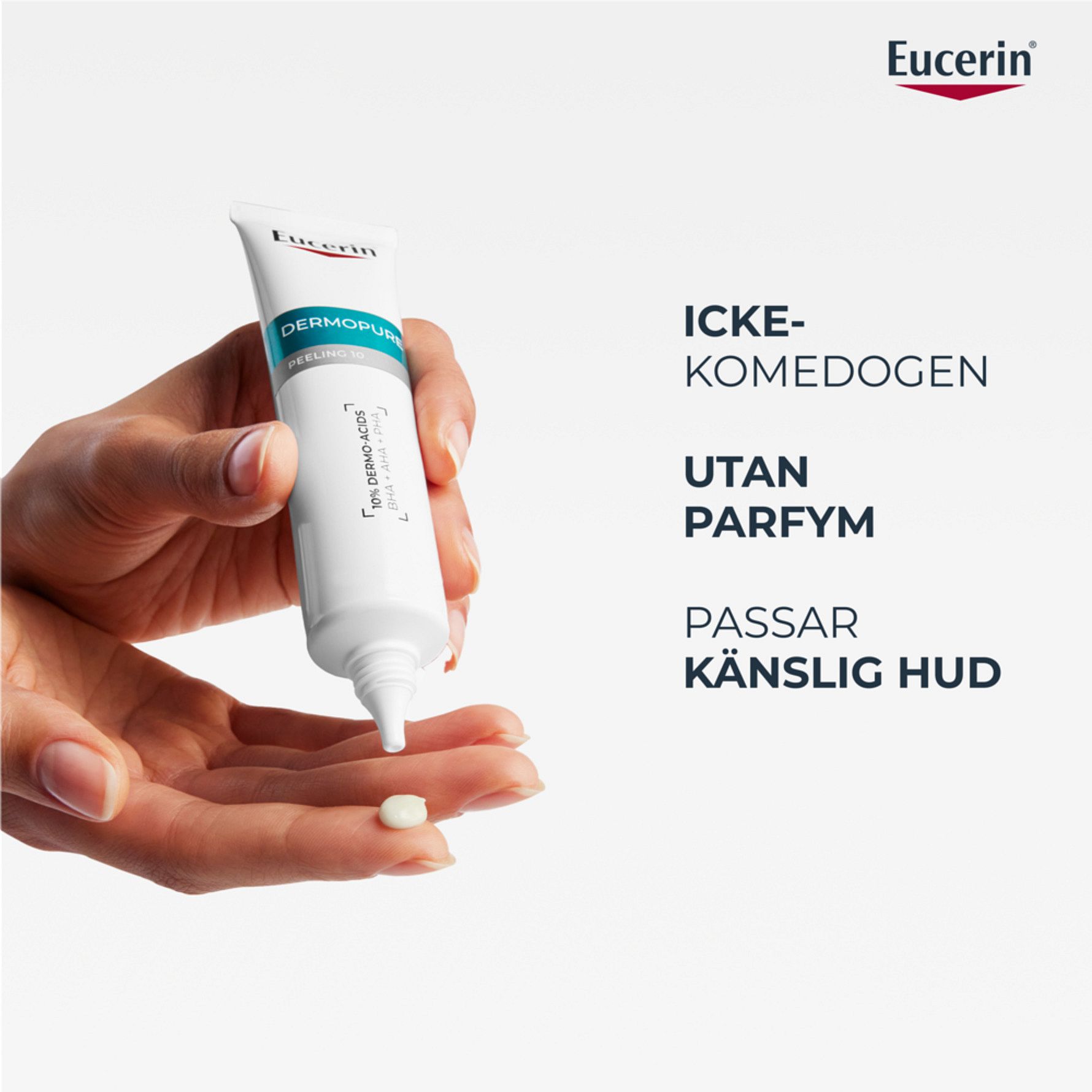 Eucerin Dermopure Peeling 10 är en koncentrerad kliniskt testad nattpeeling, som rekommenderas för att hjälpa till att synligt korrigera bestående finnar och att jämna ut hudens struktur. Den innehåller en 10% kombination av de dermoaktiva ämnena Salicylsyra (BHA), Glykolsyra (AHA) och Glokonolakton (PHA) som exfolierar huden, samtidigt som den återfuktas. Den korrigerar märken och hjälpter till att minska de första ålderstecknen. Huden blir synligt slätare och ljusare. Effektiv från dag ett. Passar från 12 år och för alla hudtyper. Parfymfri.