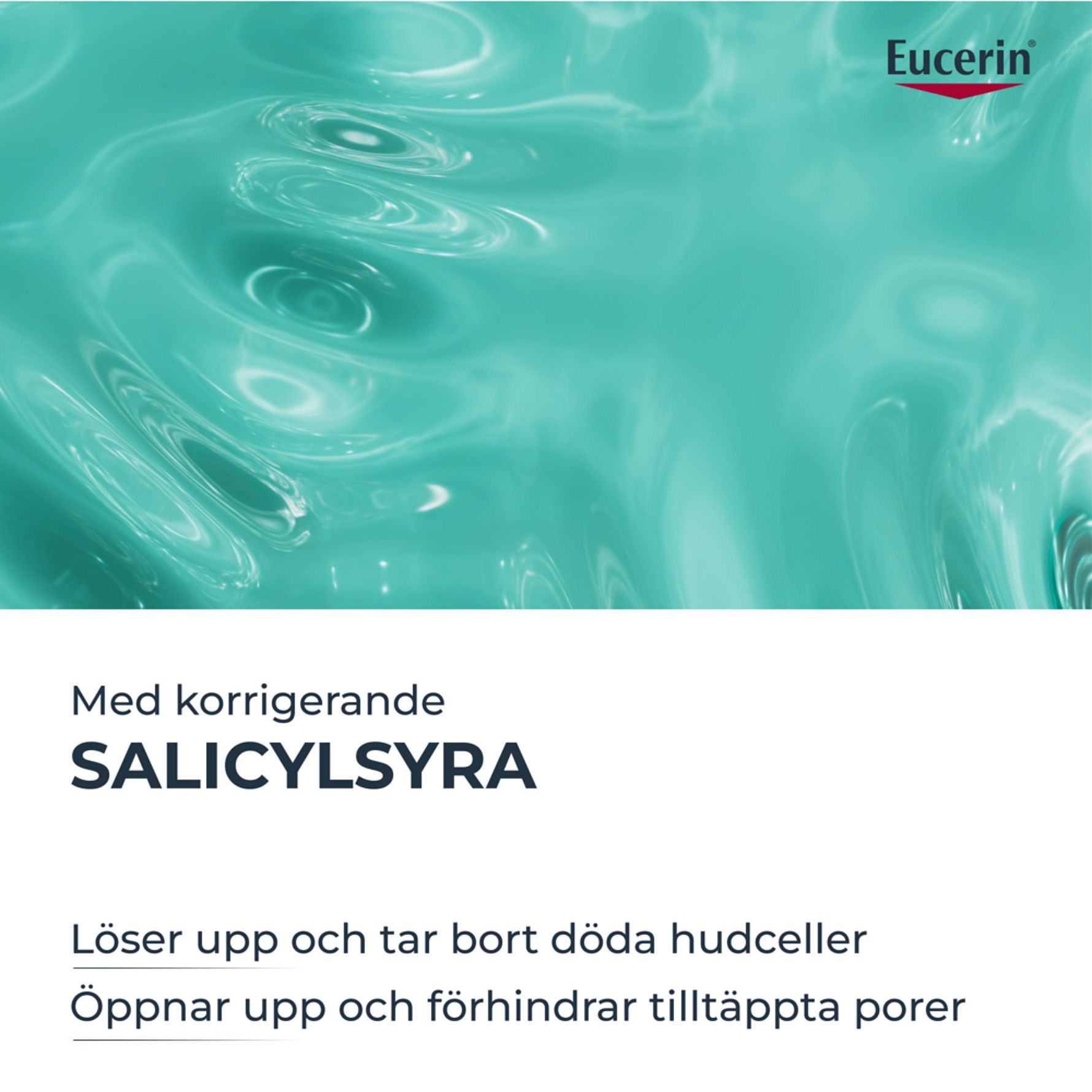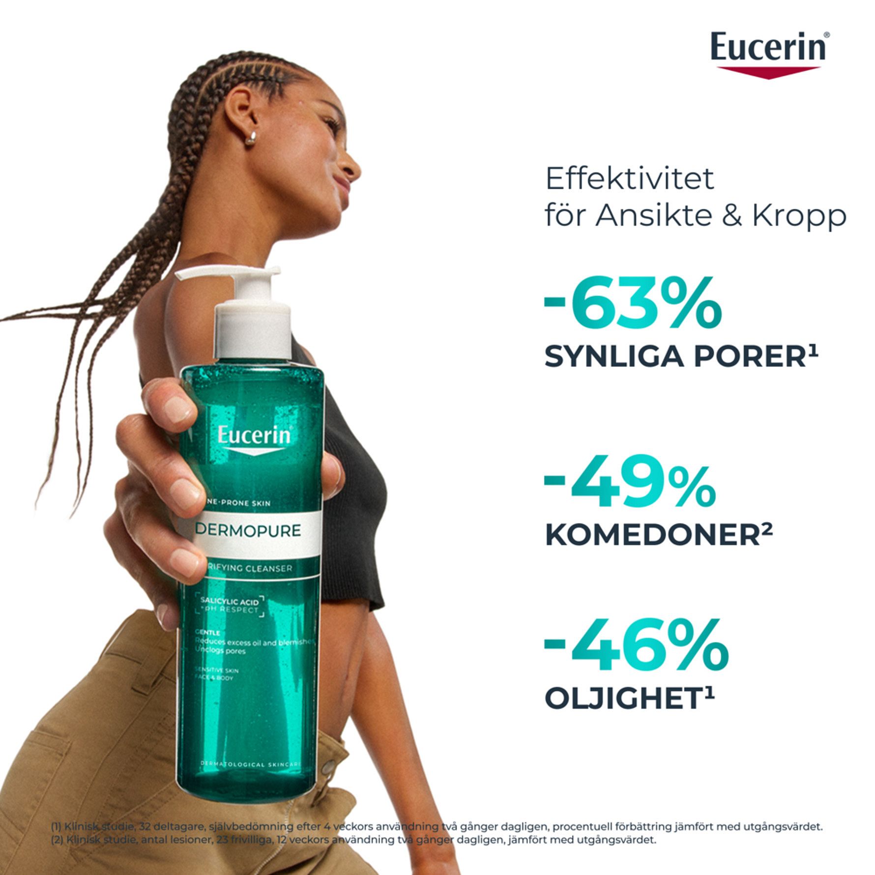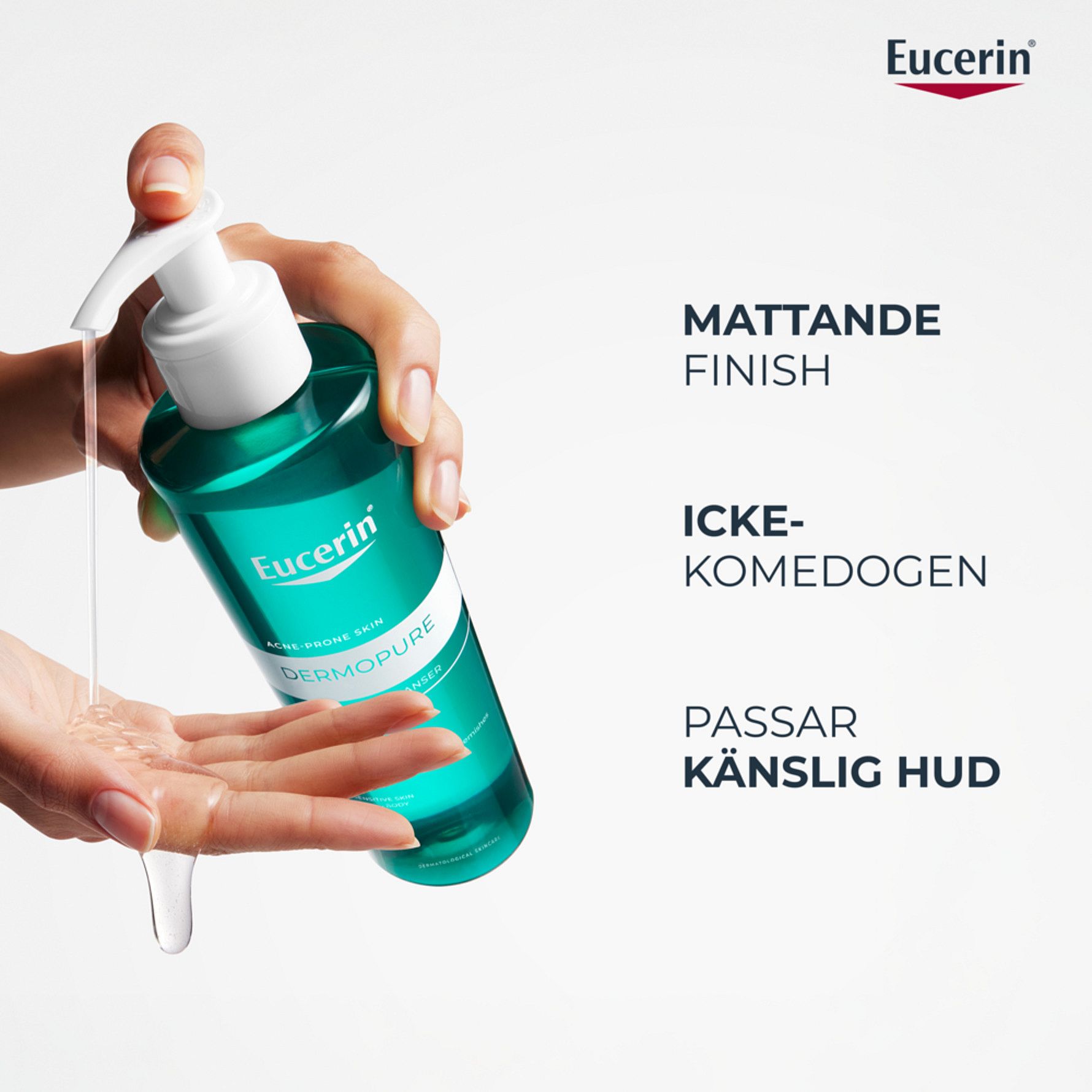 Eucerin Dermopure Purifying Cleanser är en rengöringsgel som passar aknebenägen och oljig hud. Denna milda gelformula innehåller endast 8 ingredienser, varav Salicylsyra (BHA) är huvudingrediensen som rengör huden utan att torka ut den. Formulan är även tvålfri och parfymfri, vilket gör den extra skonsam.