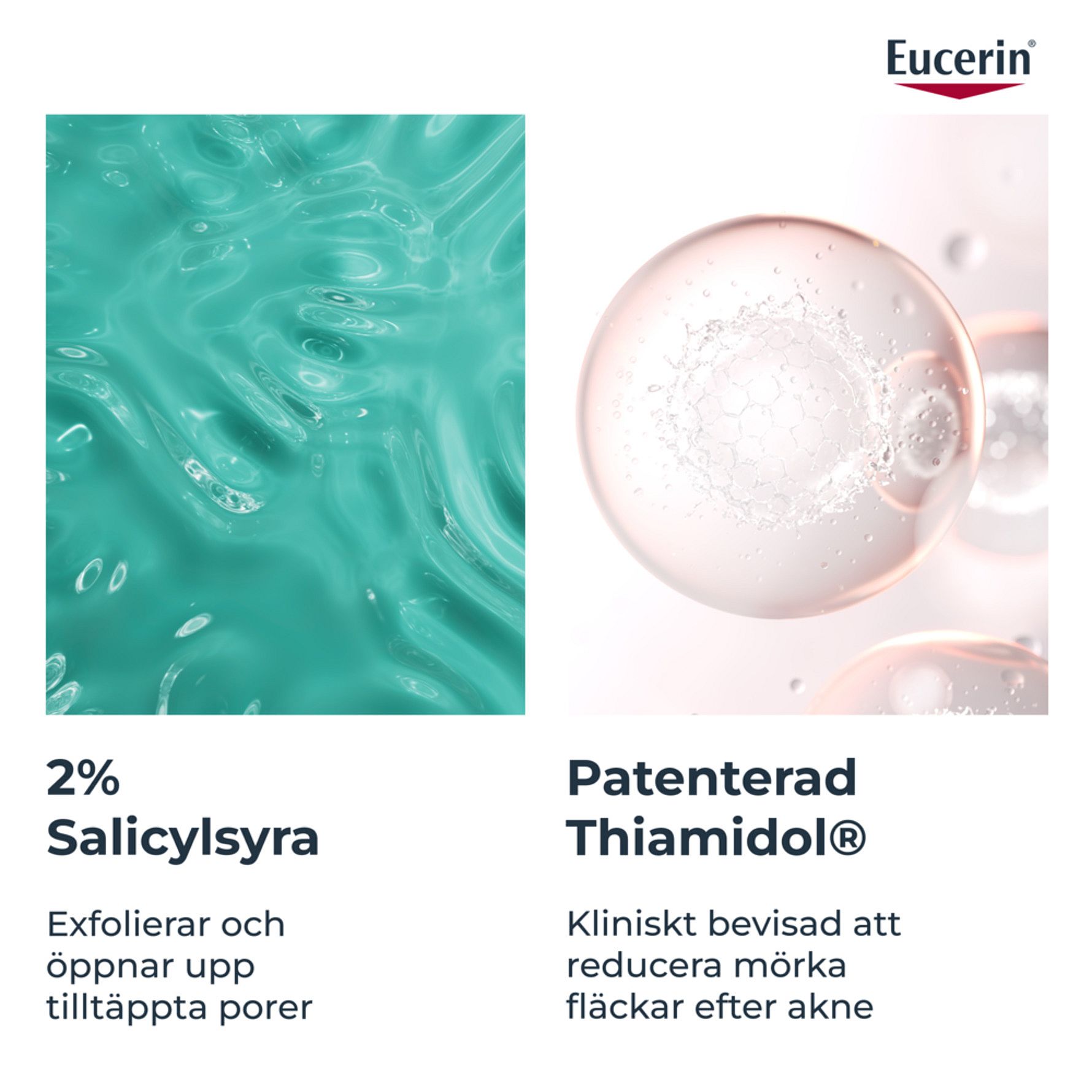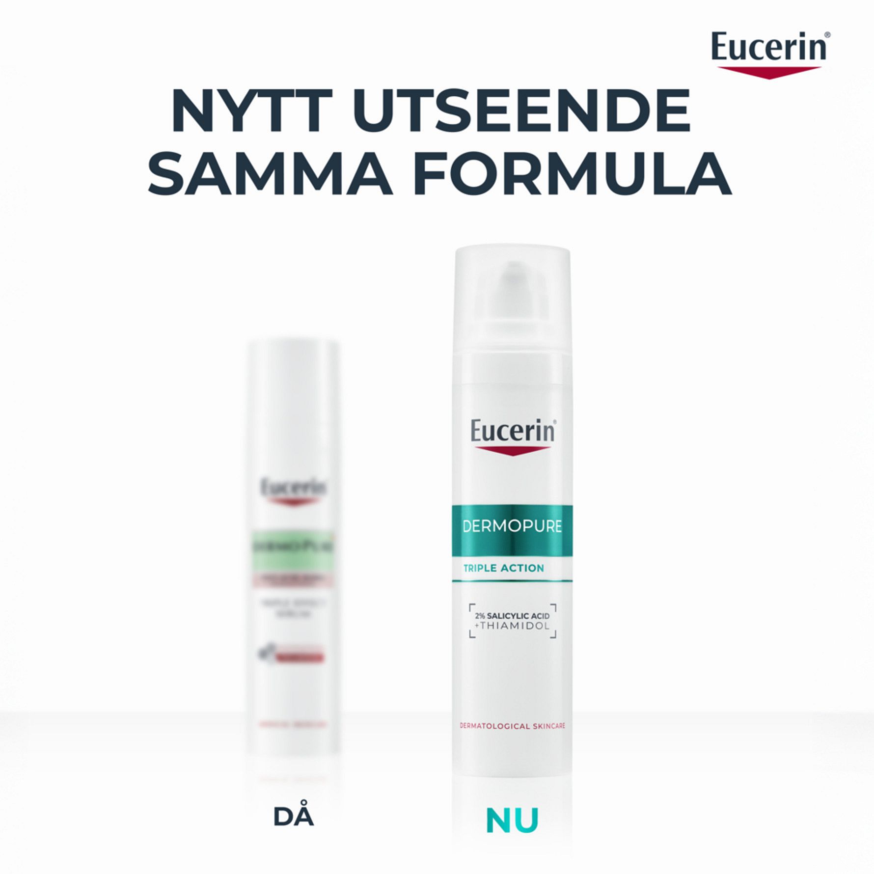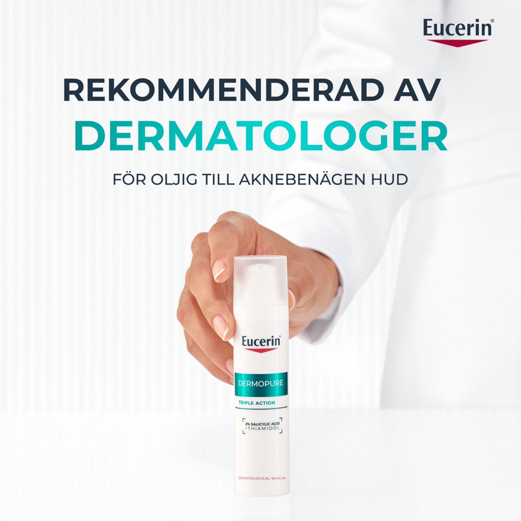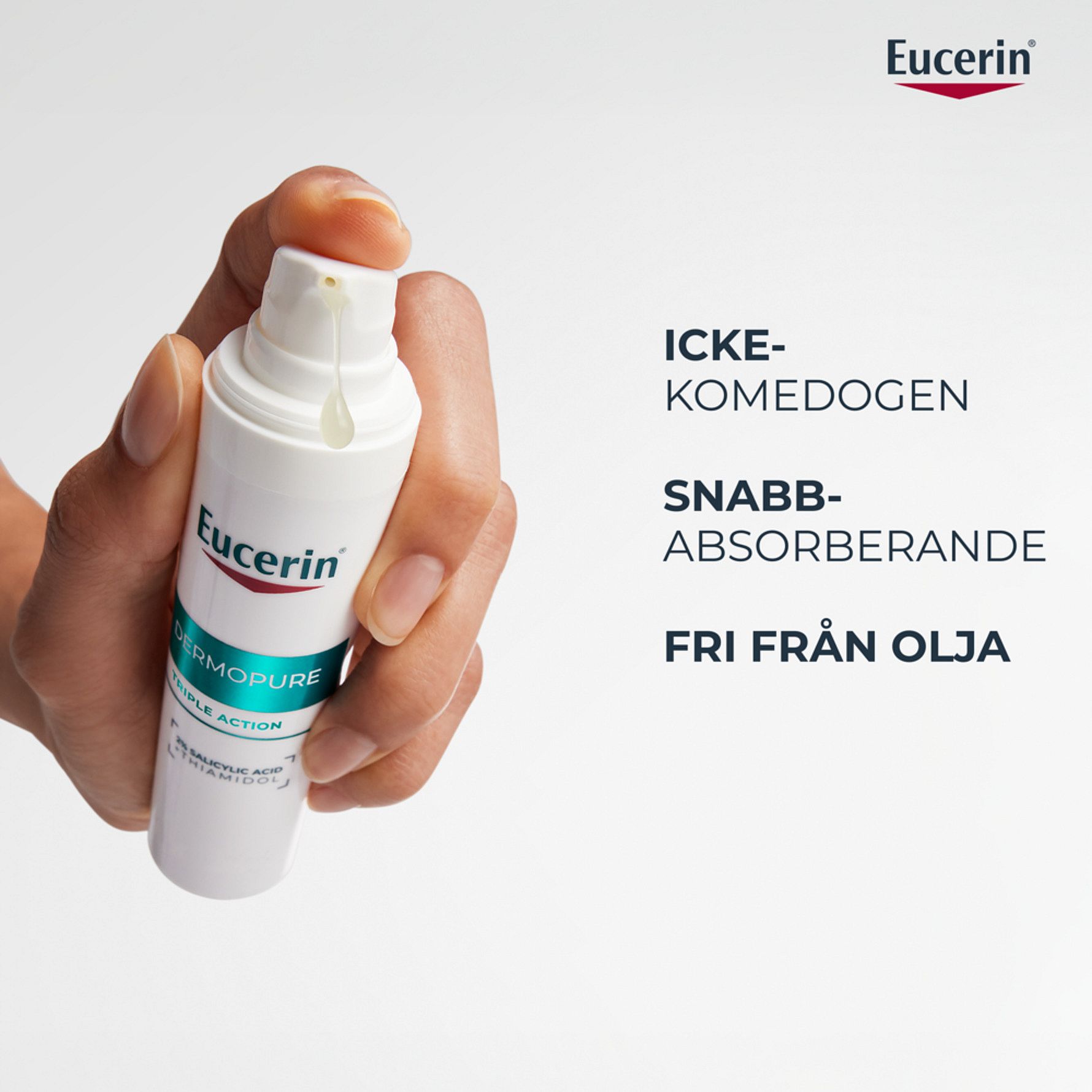 Eucerin Dermopure Triple Action Serum är ett trippelverkande oljefritt och fuktgivande serum, som synbart korrigerar blemmor, komedoner och mörka fläckar efter akne. Det rekommenderas till oljig och aknebenägen hud och innehåller en unik kombination av dermoaktiva ämnen: 2% Salicylsyra (BHA) för att exfoliera huden och reducera fläckar, samt Thiamidol® för att minska mörka fläckar efter akne.