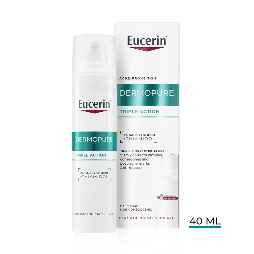 Eucerin Dermopure Triple Action Serum är ett trippelverkande oljefritt och fuktgivande serum, som synbart korrigerar blemmor, komedoner och mörka fläckar efter akne. Det rekommenderas till oljig och aknebenägen hud och innehåller en unik kombination av dermoaktiva ämnen: 2% Salicylsyra (BHA) för att exfoliera huden och reducera fläckar, samt Thiamidol® för att minska mörka fläckar efter akne.