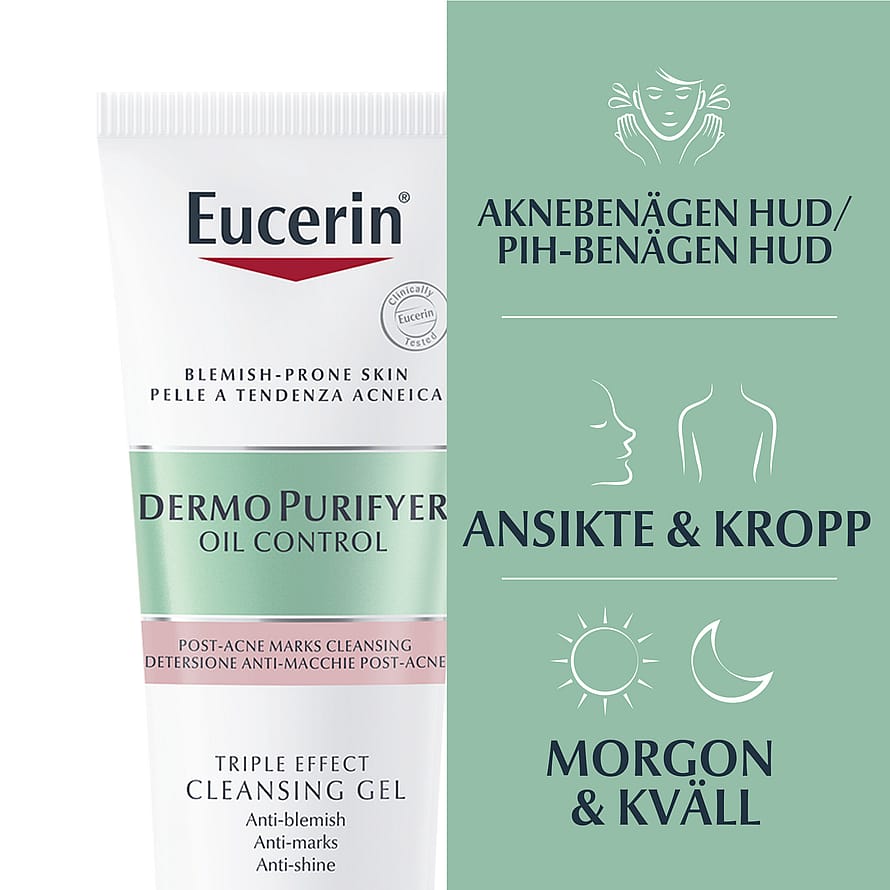 Eucerin DermoPurifyer Oil Control Triple Effect Cleansing Gel är en rengöringsgel för aknebenägen hud för ansikte och kropp.
