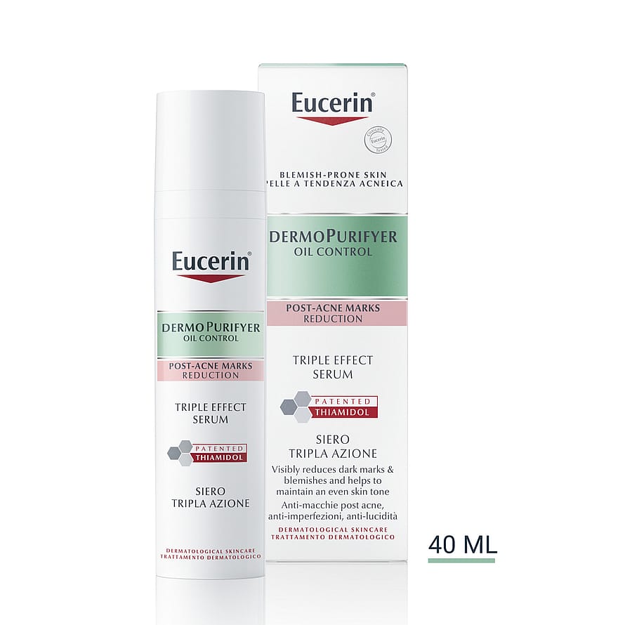 Eucerin DermoPurifyer Triple Effect Serum är ett trippelverkande serum lämplig för aknebenägen hud med hyperpigmentering.