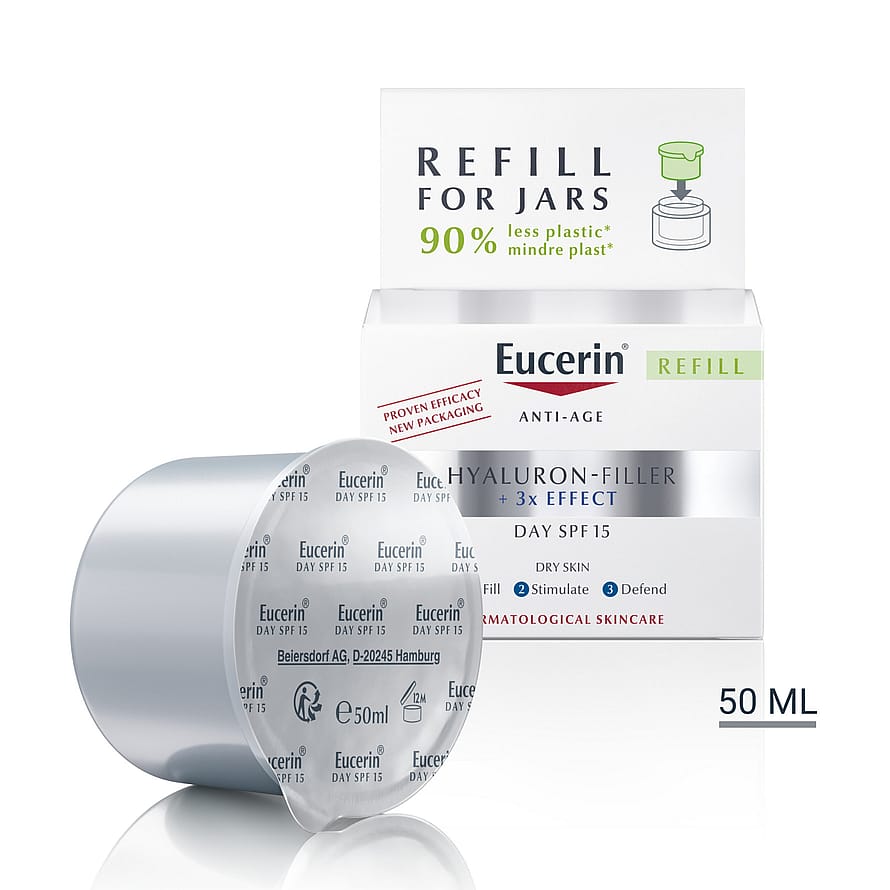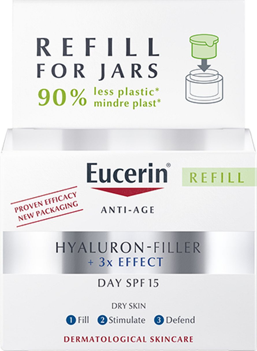 Med åldern minskar hudens naturliga produktion av Hyaluronsyra, vilket leder till att fina linjer och rynkor bildas. Denna dagkräm använder en innovativ trippelverkande formula för att motverka denna process. Hög- och lågmolekylär Hyaluronsyra återfuktar och fyller ut rynkor, medan Antioxidanten Saponin aktiverar hudens naturliga produktion av Hyaluronsyra och skyddar huden från fria radikaler. Enoxolone reducerar nedbrytningen av Hyaluronsyra med mer än 50%. Resultatet är en synligt yngre och strålande hud. Refillförpackning innehåller 90% mindre plast än ordinarie förpackning, vilket bidrar till en mer hållbar produktlivscykel. Produkten är kompatibel med alla Eucerins ansiktsburkar.