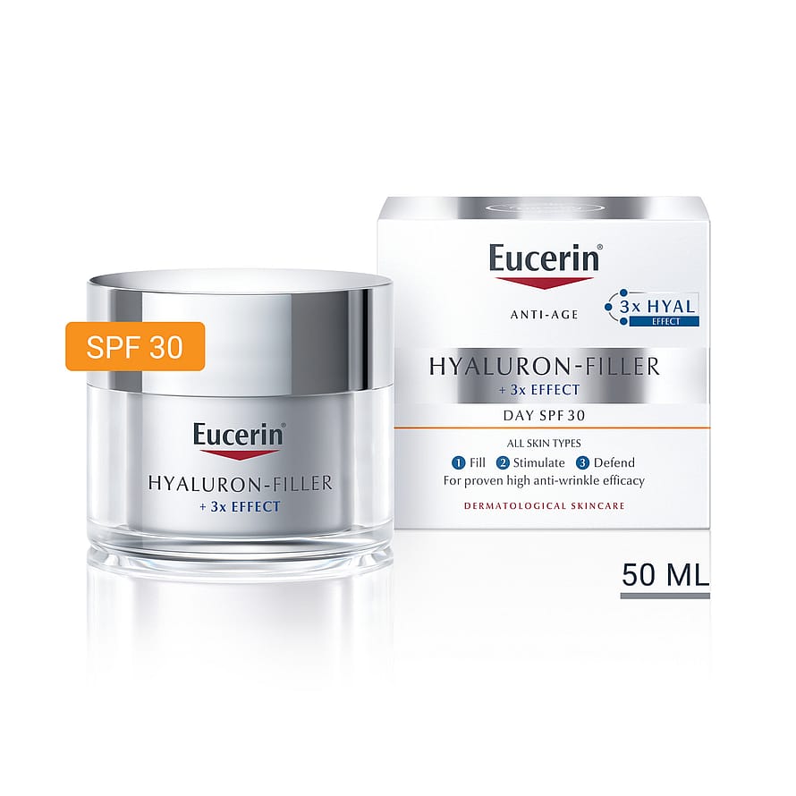 Med åldern reduceras hudens naturliga produktion av Hyaluronsyra vilket leder till att fina linjer och rynkor bildas. Eucerins innovation med 3x Effekt hjälper till att motverka denna process. Hög- och lågmolekylär Hyaluronsyra återfuktar och fyller ut rynkor. Antioxidanten Saponin aktiverar hudens naturliga produktion av Hyaluronsyra med upp till 256% och hjälper till att skydda huden från fria radikaler. Enoxolone reducerar graden av nedbrytning av Hyaluronsyra med mer än 50%. Dagcremen innehåller SPF30 och UVA-skydd som hjälper till att effektivt motverka UV-inducerat förtida åldrande av huden och att rynkor blir djupare. Resultatet är en synligt slätare och strålande hud.