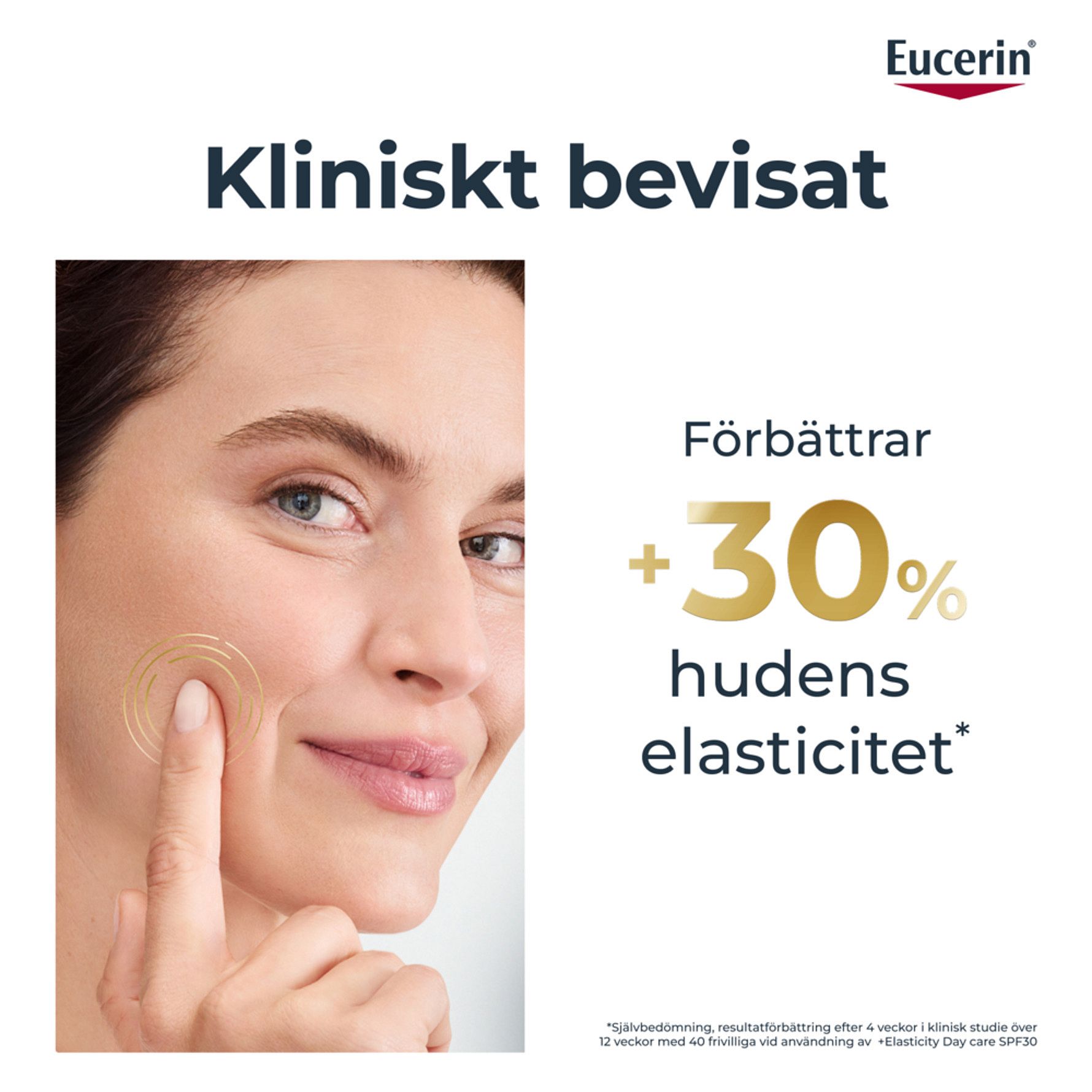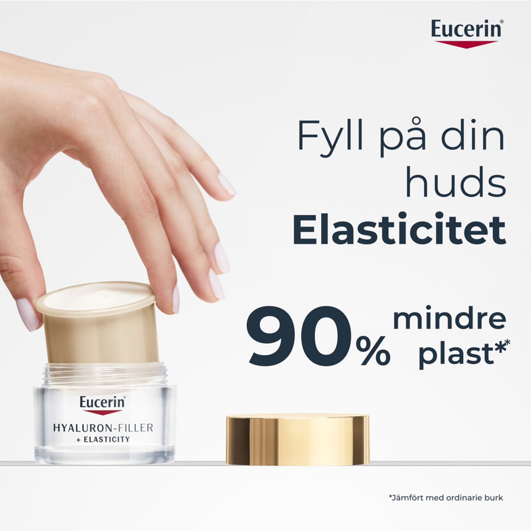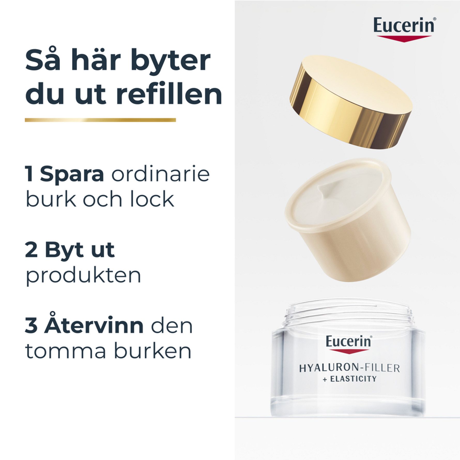 I takt med hudens åldrande förändras hudens struktur. Den förlorar elasticitet och fasthet, medan antalet mörka fläckar och rynkor ökar. Eucerin Hyaluron-Filler + Elasticity Day Creme är speciellt framtagen för att motverka tecken på åldrande genom att ge huden mer elasticitet, reducera mörka fläckar, och fylla ut rynkor. Dagcremen innehåller Kollagen-Elastin Komplex, en kraftfull kombination av Arctiin & Keratin, som hjälper till att stödja hudens egna produktion av kollagen och ökar hudens elasticitet. Ingrediensen Thiamidol® är kliniskt bevisad att reducera uppkomsten av mörka fläckar, med första synliga resultat efter 2 veckor. Formulan med hög- och lågmolekylär Hyaluronsyra återfuktar och fyller ut även djupa rynkor. SPF30 + UVA-skydd hjälper till att motverka hudens förtidiga UV-inducerade åldrande och att rynkor blir djupare. Resultatet är en synbart fastare, jämnare och strålande hud. Den hållbara refillförpackningen innehåller 90% mindre plast än standard Hyaluron-Filler burken. Du hjälper till att reducera plastavfall & bidrar till en mer hållbar produktlivscykel. Komptibel med alla Eucerins ansiktsburkar.
