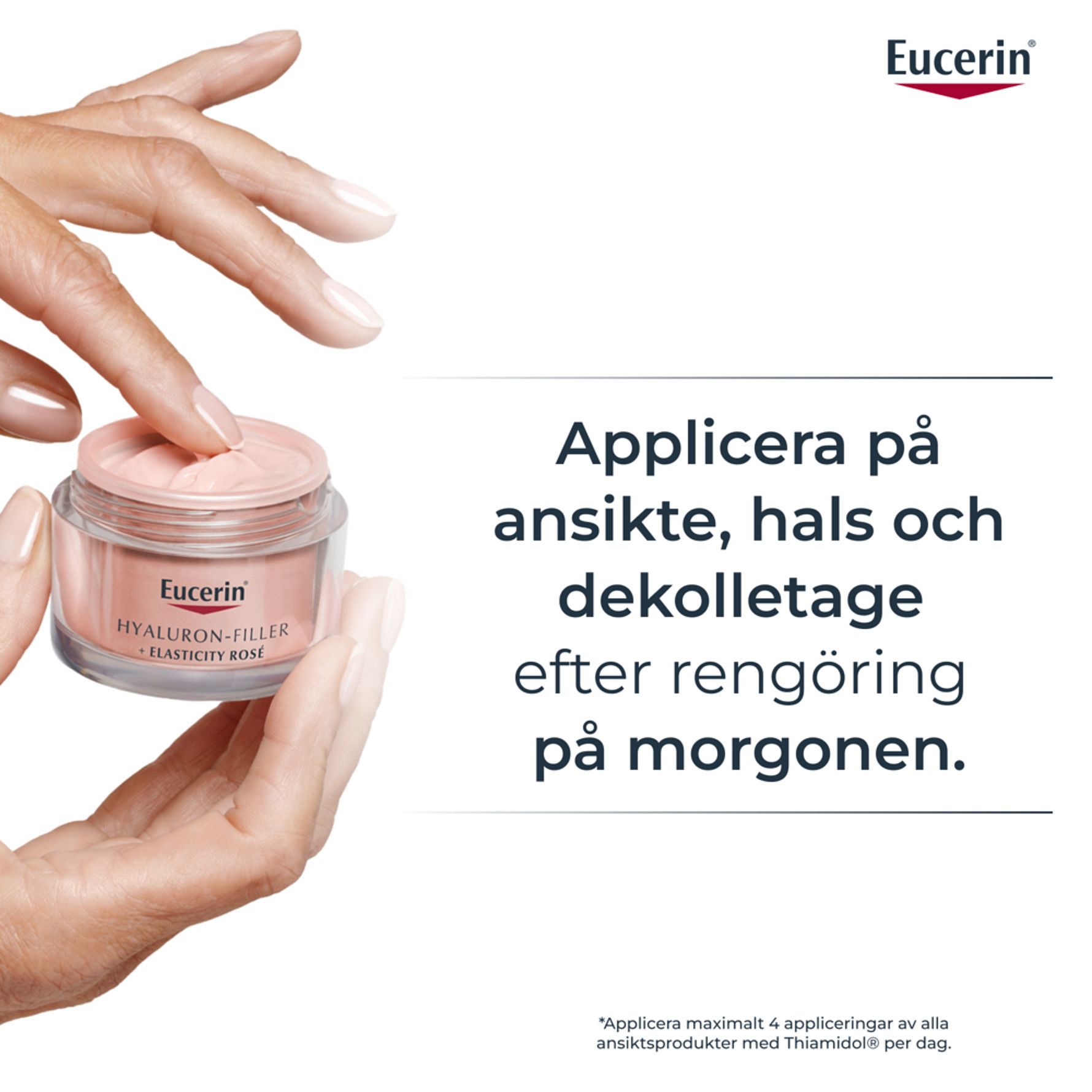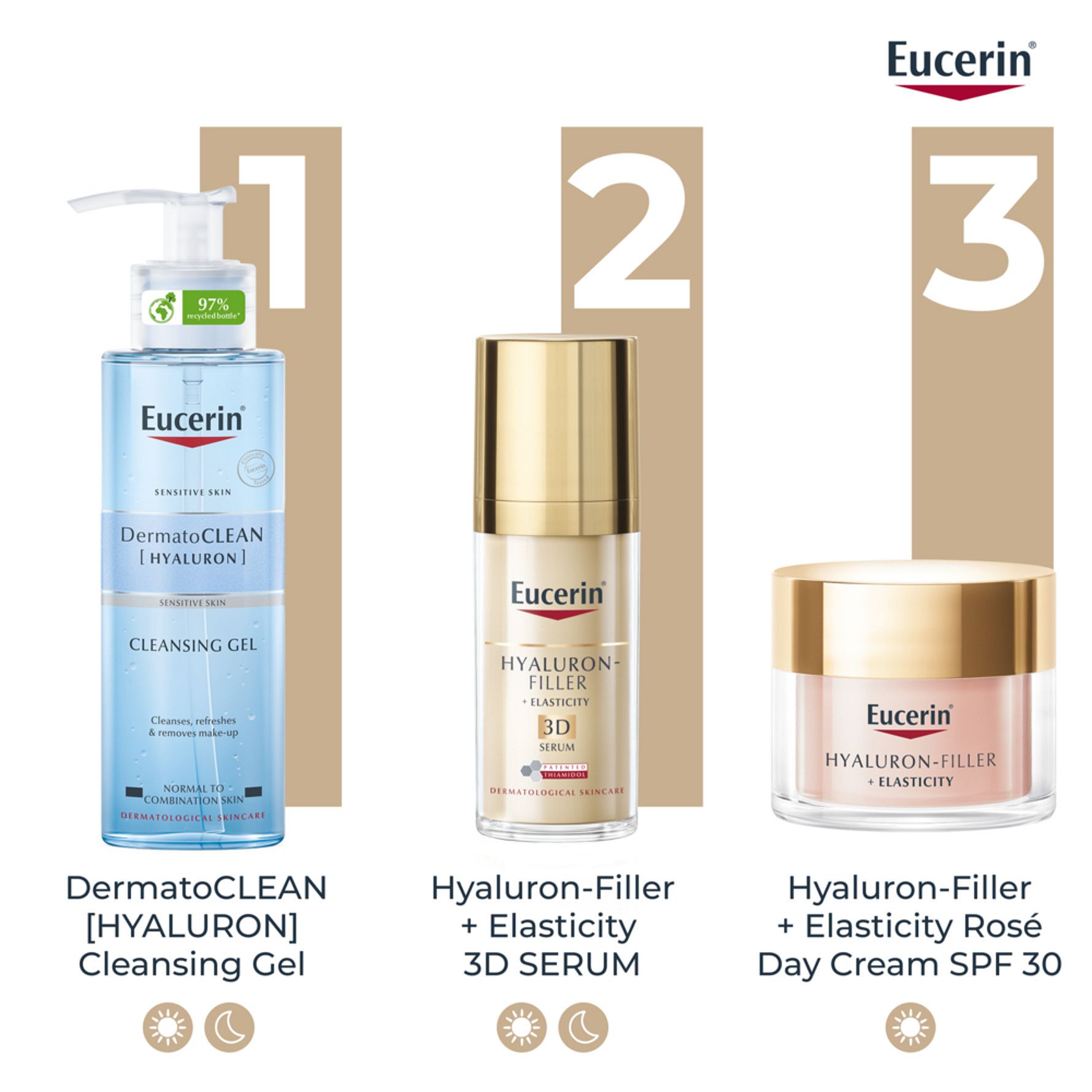 Eucerin Hyaluron-Filler + Elasticity Day Rosé SPF30 refill är en lätt rosafärgad dagcreme i hållbar refillförpackning som är framtagen för att minska visuella ålderstecken.