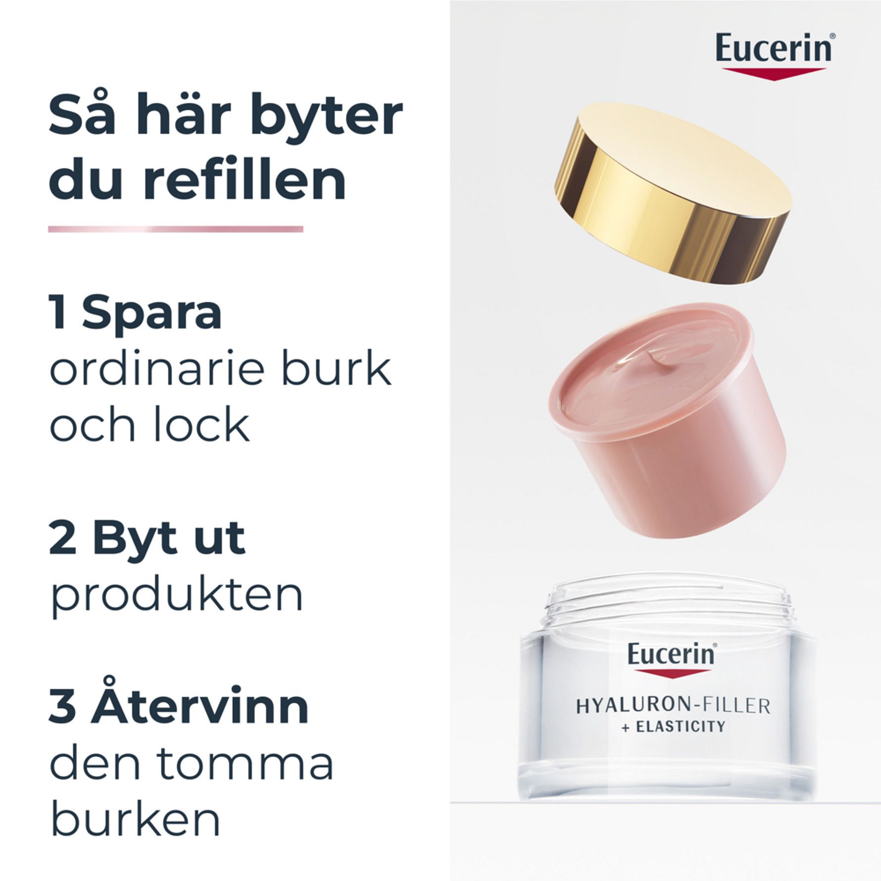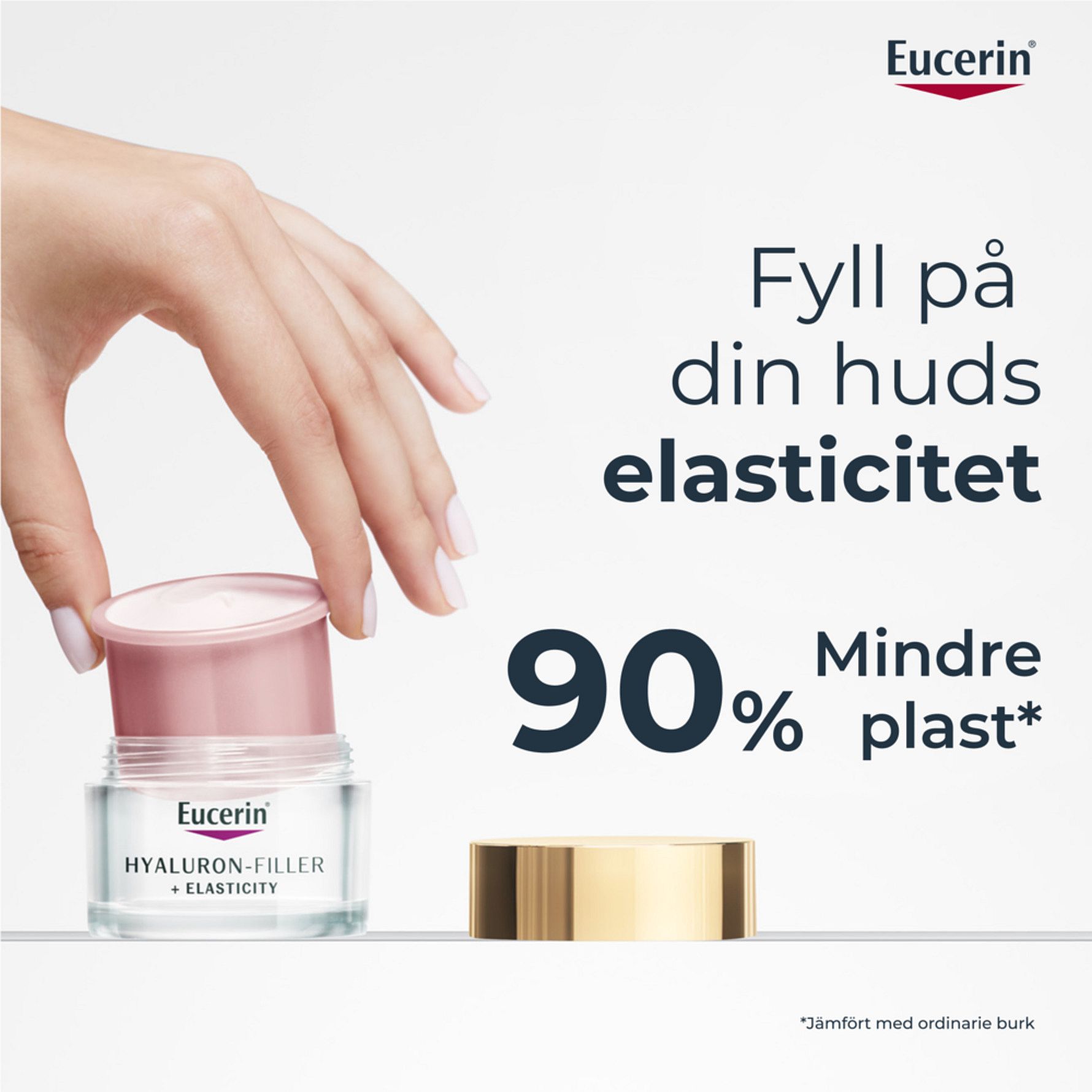 I takt med hudens åldrande förändras hudens struktur. Den förlorar elasticitet och fasthet, medan antalet mörka fläckar och rynkor ökar. Eucerin Hyaluron-Filler + Elasticity är speciellt framtagen för att motverka tecken på åldrande genom att ge huden mer elasticitet, reducera mörka fläckar, och fylla ut rynkor. Dagcremen innehåller Kollagen-Elastin Komplex, en kraftfull kombination av Arctiin & Keratin, som hjälper till att stödja hudens egna produktion av kollagen och ökar hudens elasticitet. Ingrediensen Thiamidol® är kliniskt bevisad att reducera uppkomsten av mörka fläckar, med första synliga resultat efter 2 veckor. Formulan med hög- och lågmolekylär Hyaluronsyra återfuktar och fyller ut även djupa rynkor. SPF30 + UVA-skydd hjälper till att motverka hudens förtidiga UV-inducerade åldrande och att rynkor blir djupare. Resultatet är en synbart fastare, jämnare och strålande hud med lyster. Den lätt rosafärgade formulan motverkar trött & glåmig hud, framförallt på morgonen. Den hållbara refillförpackningen innehåller 90% mindre plast än standard Hyaluron-Filler burken. Du hjälper till att reducera plastavfall & bidrar till en mer hållbar produktlivscykel. Komptibel med alla Eucerins ansiktsburkar.