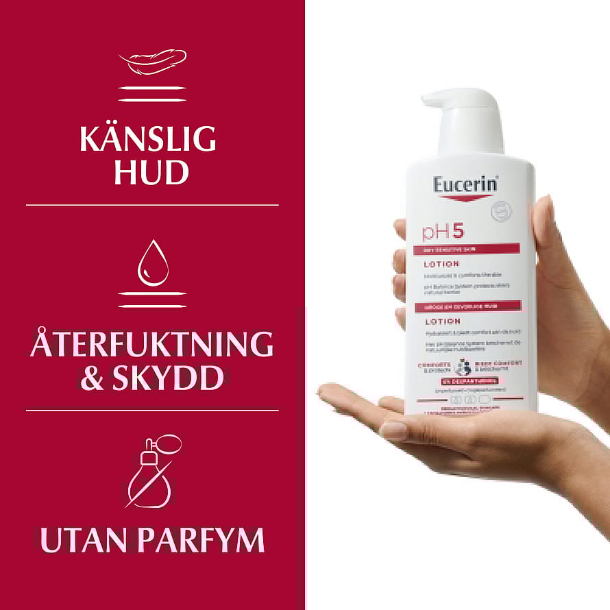 Eucerin pH5 Lotion Oparfymerad lugnar och vårdar genom att stödja hudens egna förnyelseprocess, vilket ger omedelbar och långvarig återfuktning. Formulan är berikad med 5% Dexpanthenol som ger naturlig återfuktning och omedelbart välbefinnande. Den är lämplig för mycket känslig hud som återfår styrka och skydd. Produkten absorberas snabbt och är utan parfym, vilket gör den idealisk för daglig användning på intolerant och reaktiv hud. Resultatet är en återfuktad hud vars pH-värde vårdas.