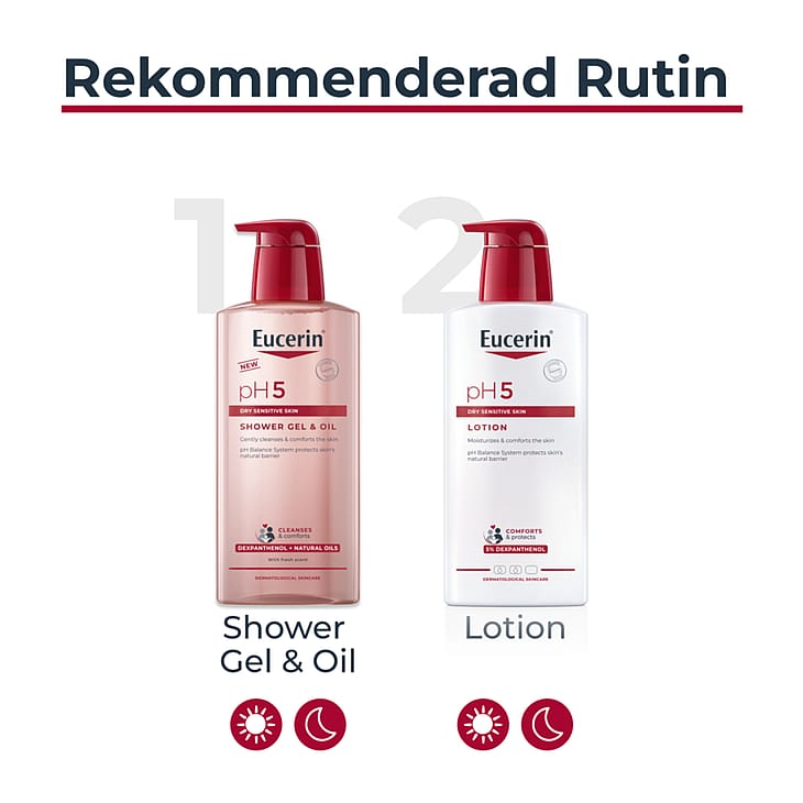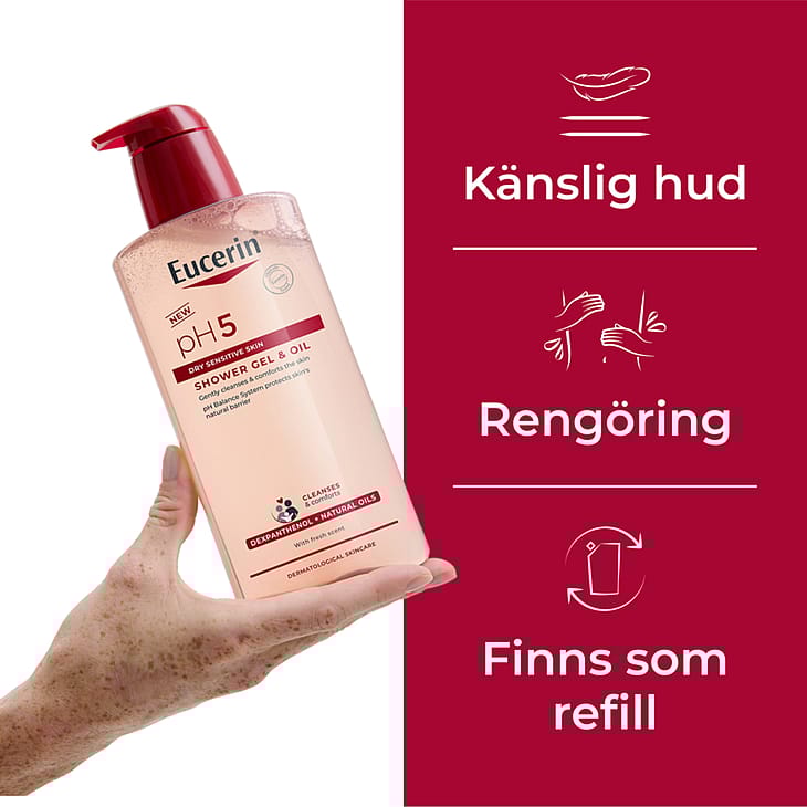 Eucerin pH5 Shower Gel & Oil är en duschgel med olja som ger en extra nivå av välbefinnande till huden. Regenerativ Dexpanthenol och naturliga oljor rengör känslig hud skonsamt men effektivt utan att lämna feta rester på huden. Den vårdande formulan med pH Balance System hjälper till att stabilisera optimalt pH-värde i huden. Resultatet blir återfuktad hud som känns smidig och som återfår sin komfortkänsla.